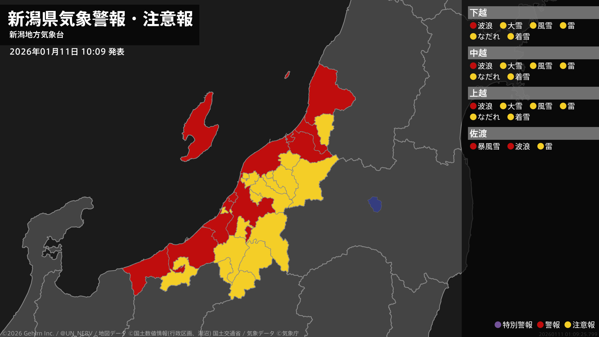 【新潟県 気象警報・注意報 2026年01月11日 10:09】佐渡では、12日明け方まで暴風雪に警戒してください。中越、上越では12日明け方まで、下越、佐渡では12日昼前まで、高波に警戒してください。#気象警報注意報 #新潟県