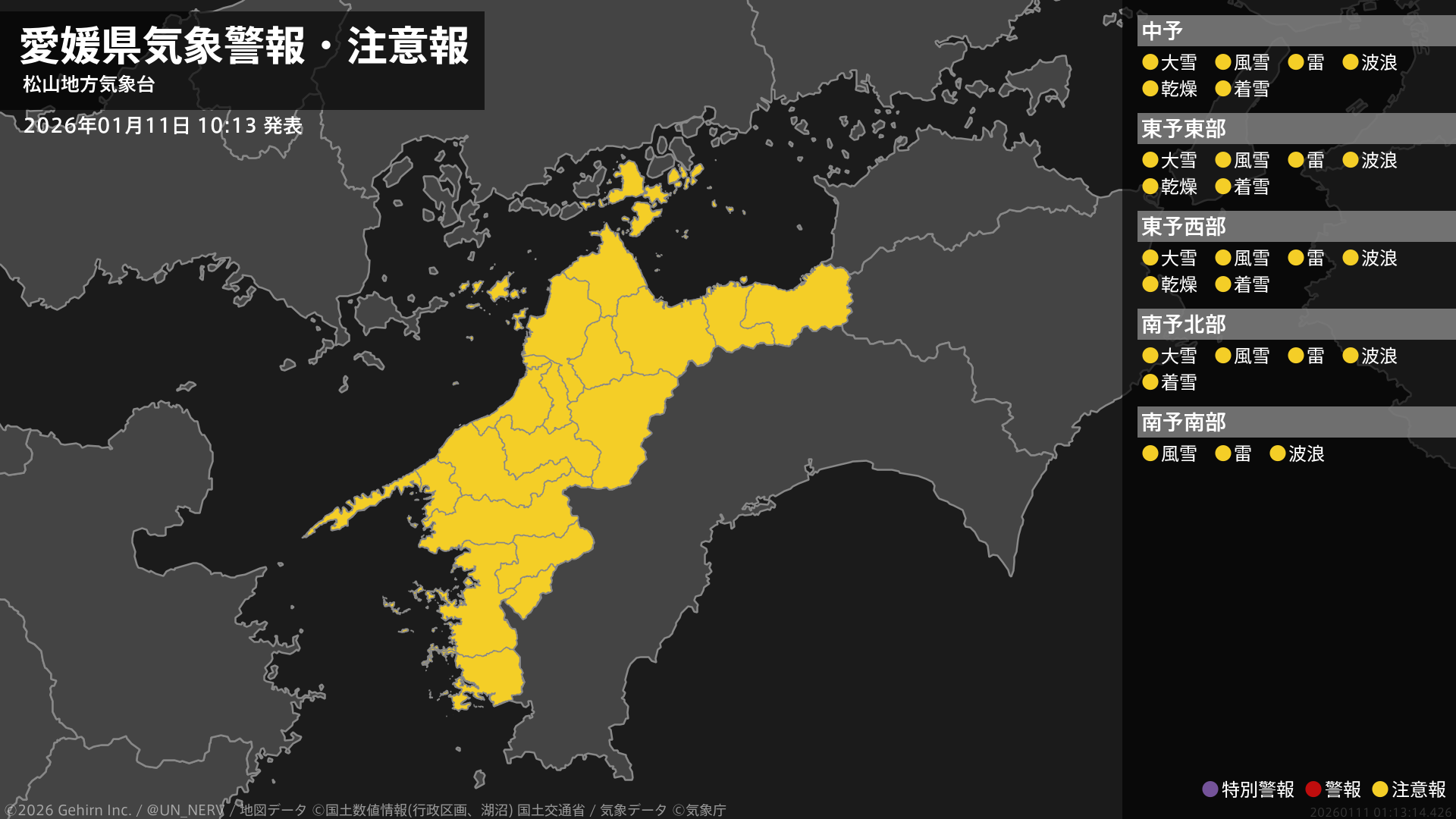【愛媛県 気象警報・注意報 2026年01月11日 10:13】愛媛県では、風雪や大雪、高波、落雷、電線等への着雪に注意してください。中予、東予では、空気の乾燥した状態が続くため、火の取り扱いに注意してください。#気象警報注意報 #愛媛県