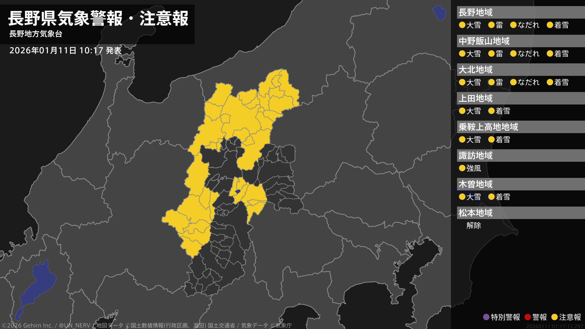 【長野県 気象警報・注意報 2026年01月11日 10:17】中部では、強風に注意してください。長野県では、大雪や電線等への着雪に注意してください。北部では、落雷やなだれに注意してください。#気象警報注意報 #長野県