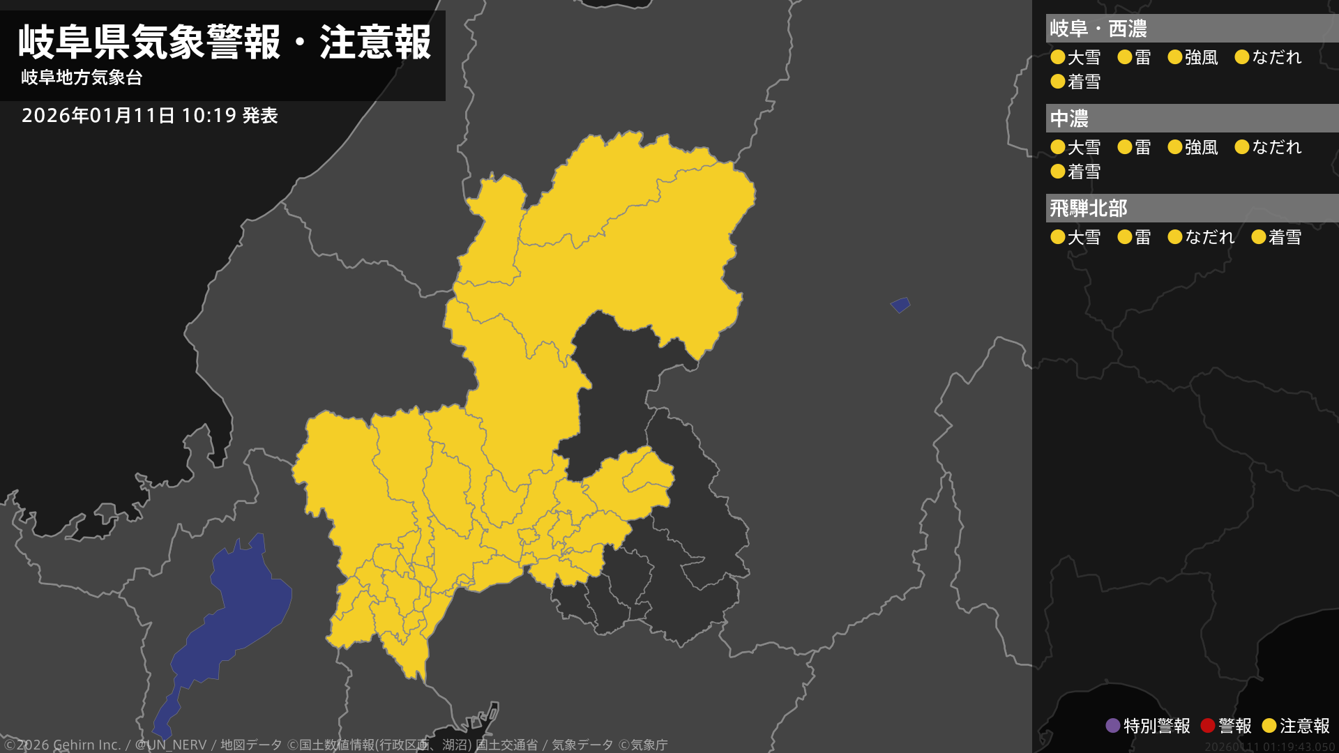 【岐阜県 気象警報・注意報 2026年01月11日 10:19】美濃地方では、11日夜遅くまで強風に注意してください。岐阜県では、12日昼前まで大雪や電線等への着雪に、12日明け方まで落雷に、13日までなだれに注意してください。#気象警報注意報 #岐阜県