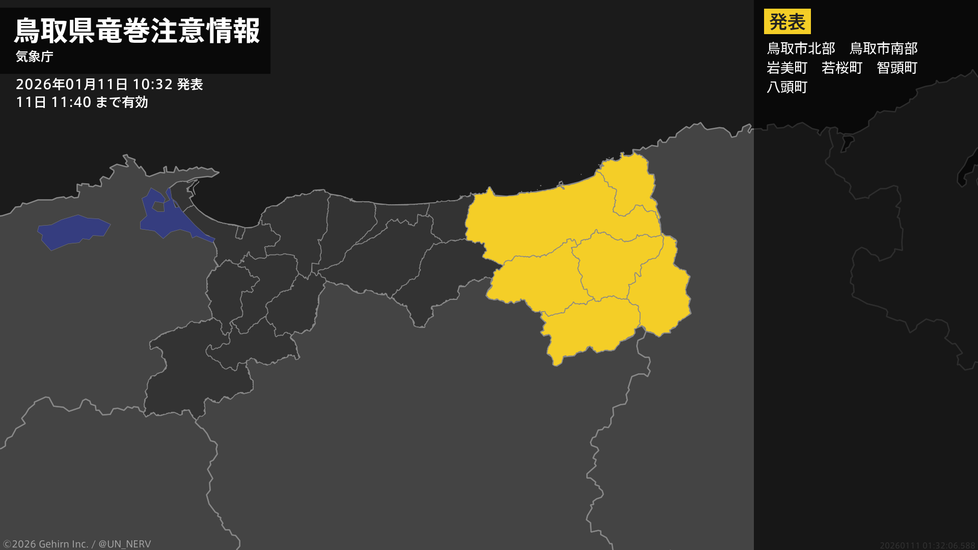 【鳥取県 竜巻注意情報】鳥取県は、竜巻などの激しい突風が発生しやすい気象状況になっています。頑丈な建物内に移動するなど安全確保に努めてください。この情報は11日11:40まで有効です。#竜巻注意情報 #鳥取県