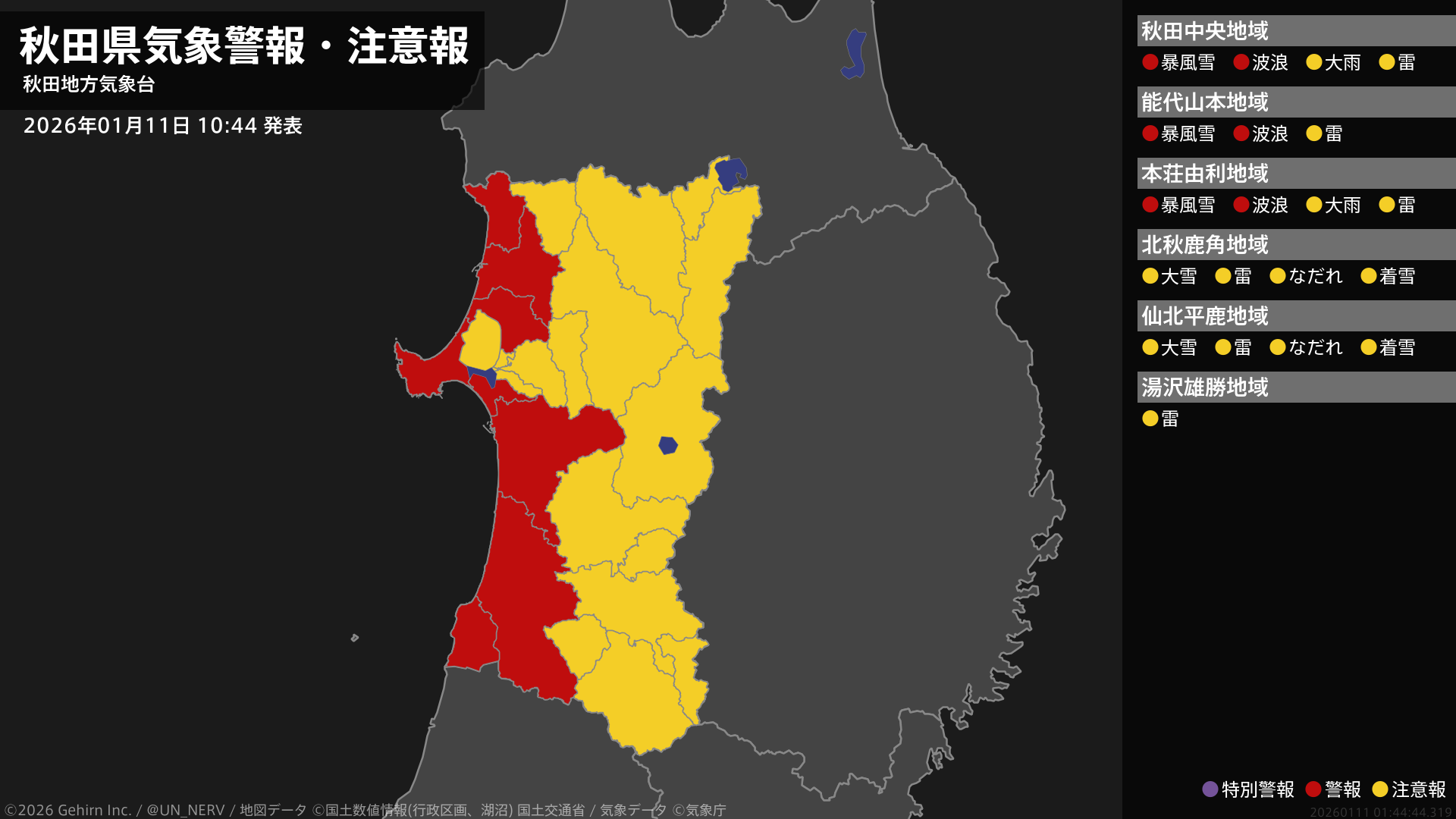 【秋田県 気象警報・注意報 2026年01月11日 10:44】沿岸では、暴風雪や高波に警戒してください。#気象警報注意報 #秋田県