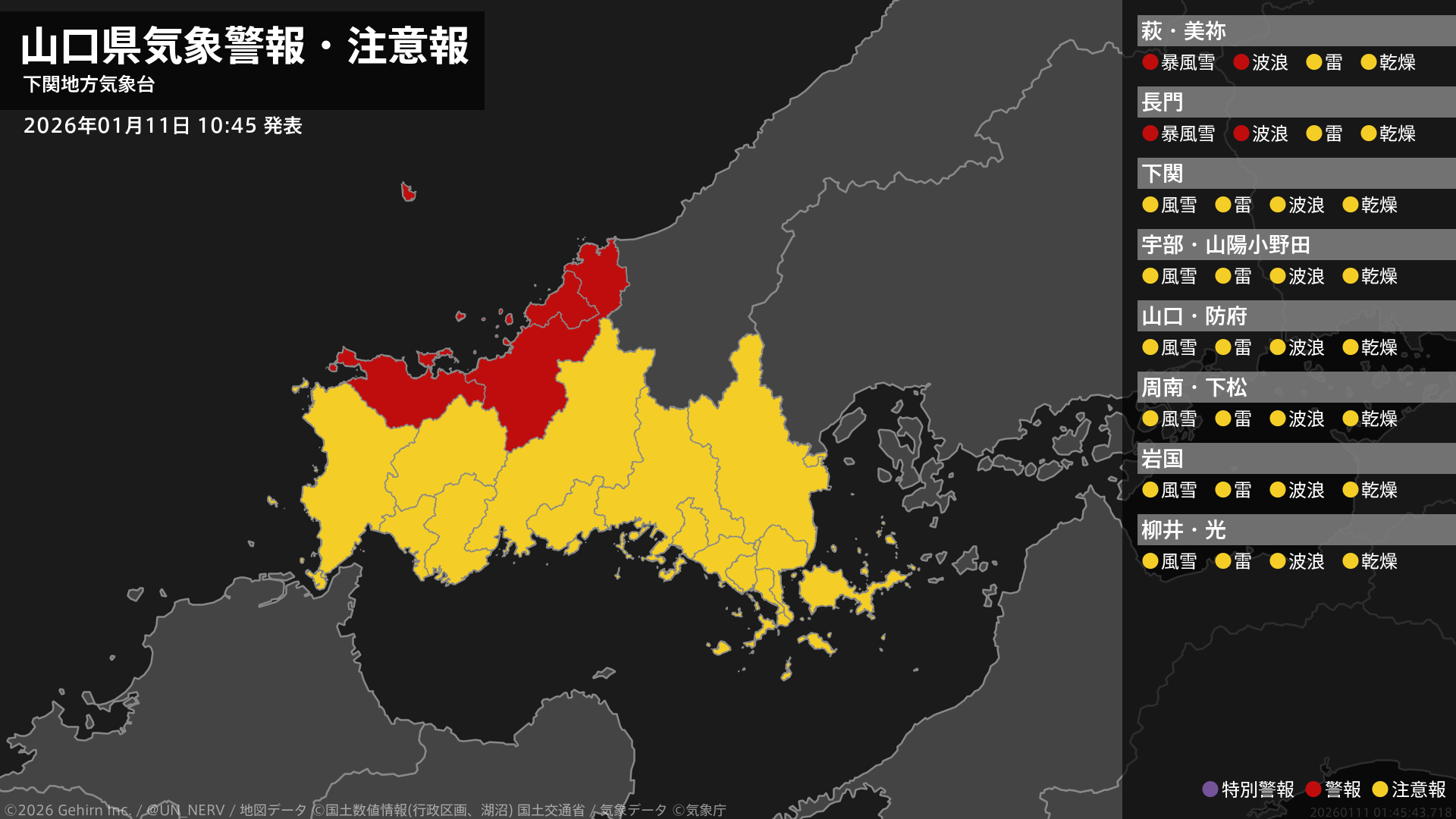 【山口県 気象警報・注意報 2026年01月11日 10:45】北部の海上では、11日昼過ぎまで暴風雪に警戒してください。北部では、11日昼過ぎまで高波に警戒してください。#気象警報注意報 #山口県