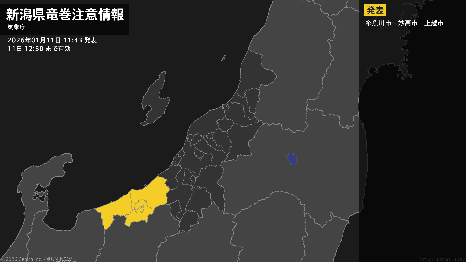 【新潟県 竜巻注意情報】新潟県は、竜巻などの激しい突風が発生しやすい気象状況になっています。頑丈な建物内に移動するなど安全確保に努めてください。この情報は11日12:50まで有効です。#竜巻注意情報 #新潟県