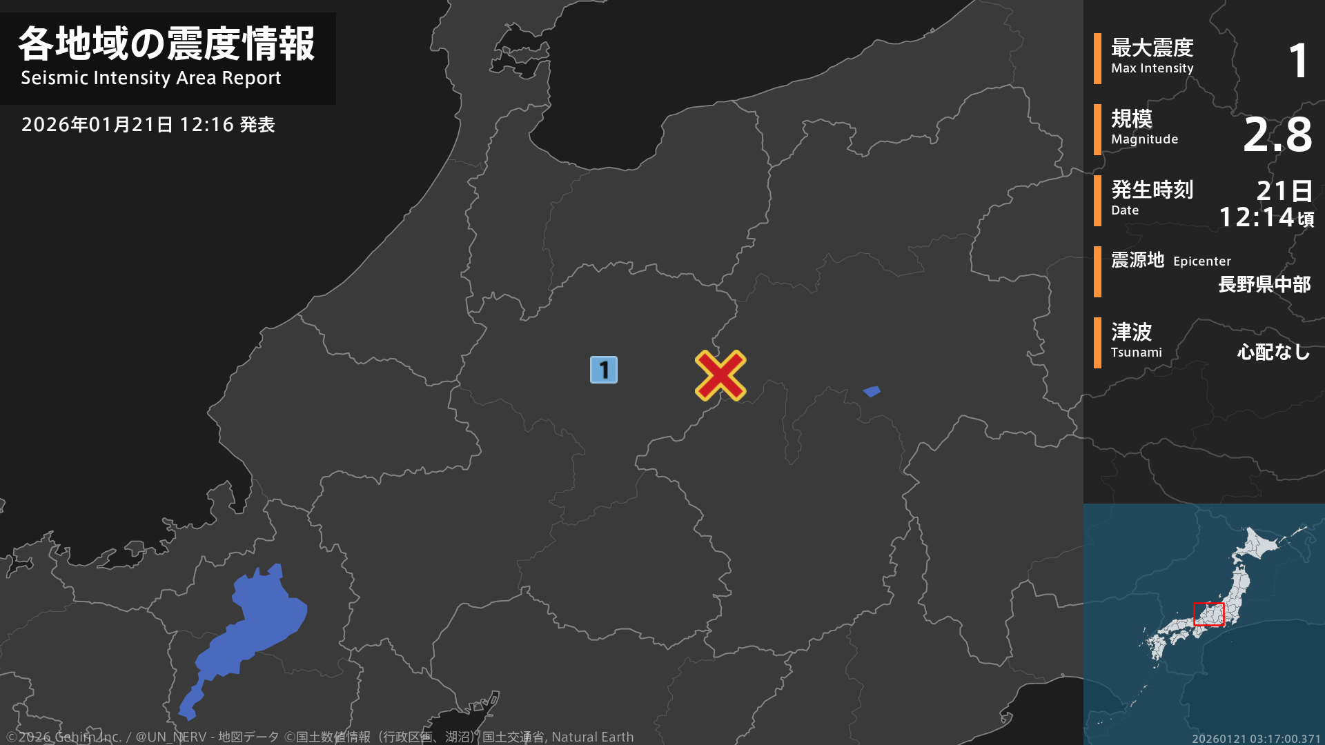 【地震情報 2026年1月21日】12時14分頃、長野県中部を震源とする地震がありました。震源の深さはごく浅い、地震の規模はM2.8、最大震度1を岐阜県で観測しています。この地震による津波の心配はありません。#地震 #岐阜県