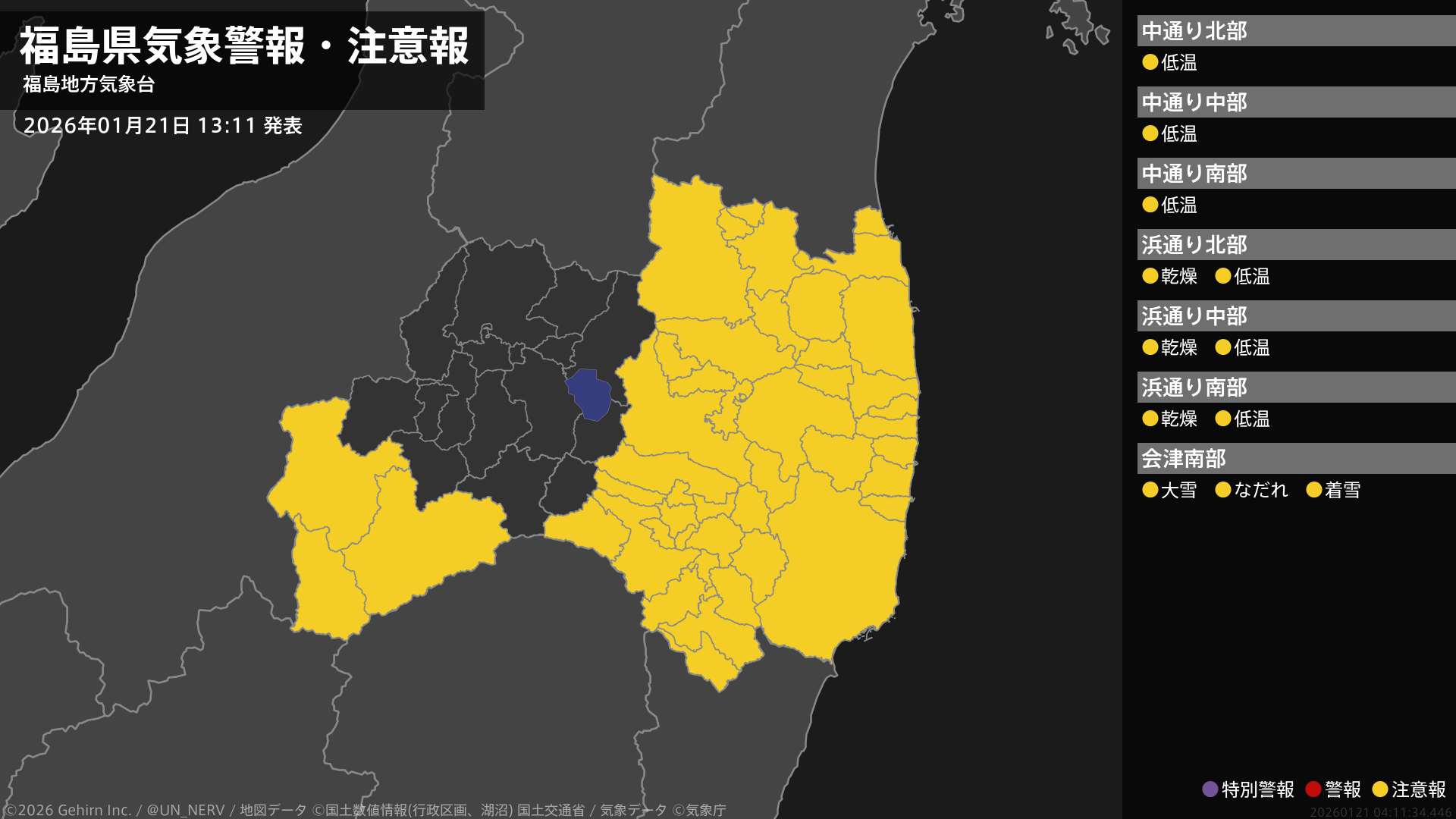 【福島県 気象警報・注意報 2026年01月21日 13:11】会津では、大雪やなだれ、電線等への着雪に注意してください。浜通りでは、空気の乾燥した状態が続くため、火の取り扱いに注意してください。中通り、浜通りでは、低温に注意してください。#気象警報注意報 #福島県