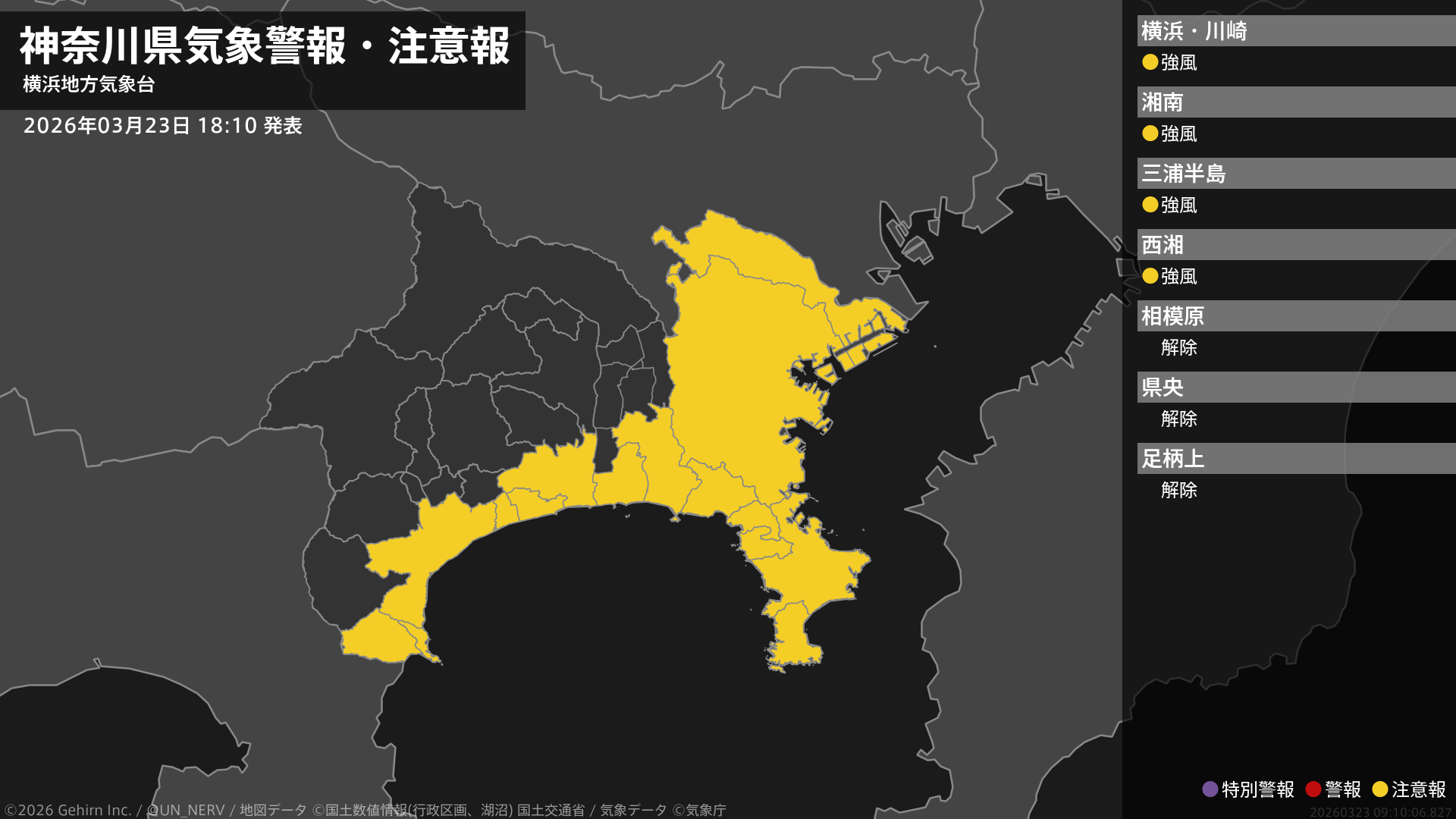 【神奈川県 気象警報・注意報 2026年03月23日 18:10】神奈川県では、23日夜遅くから24日昼前まで強風に注意してください。#気象警報注意報 #神奈川県