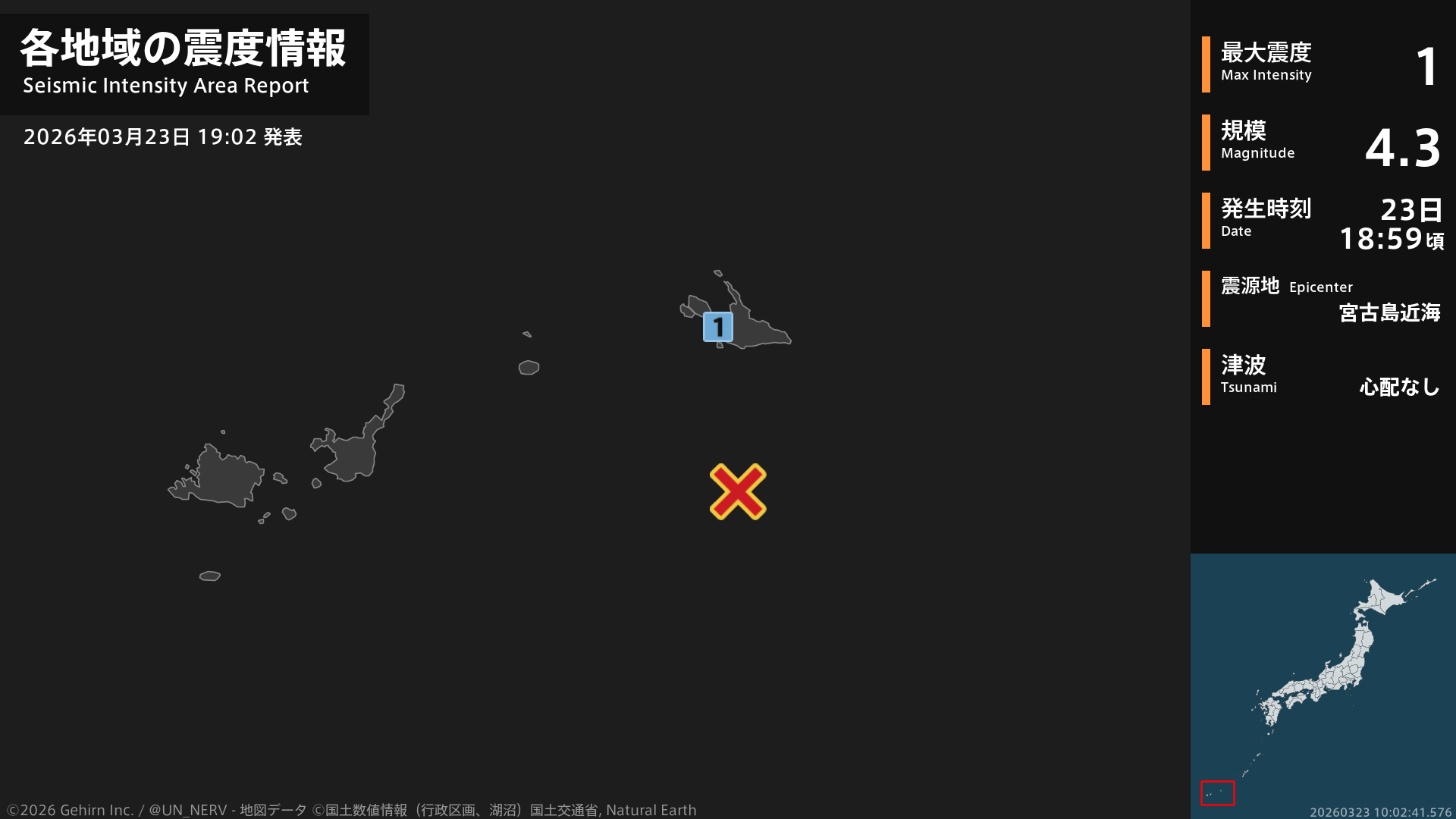 【地震情報 2026年3月23日】18時59分頃、宮古島近海を震源とする地震がありました。震源の深さは約50km、地震の規模はM4.3、最大震度1を沖縄県で観測しています。この地震による津波の心配はありません。#地震 #沖縄県