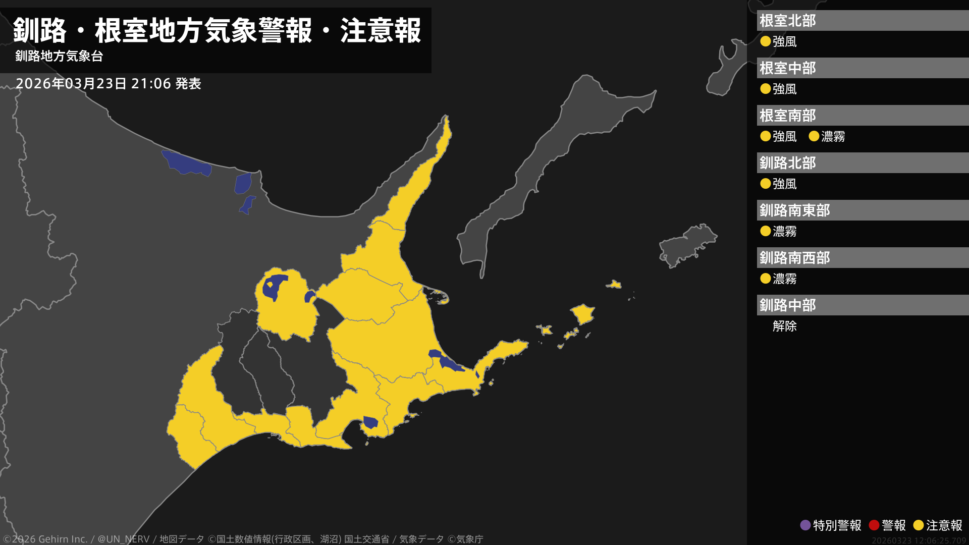 【釧路・根室地方 気象警報・注意報 2026年03月23日 21:06】根室、釧路地方では、24日未明から24日夕方まで強風に、24日明け方まで濃霧による視程障害に注意してください。#気象警報注意報 #根室地方 #釧路地方
