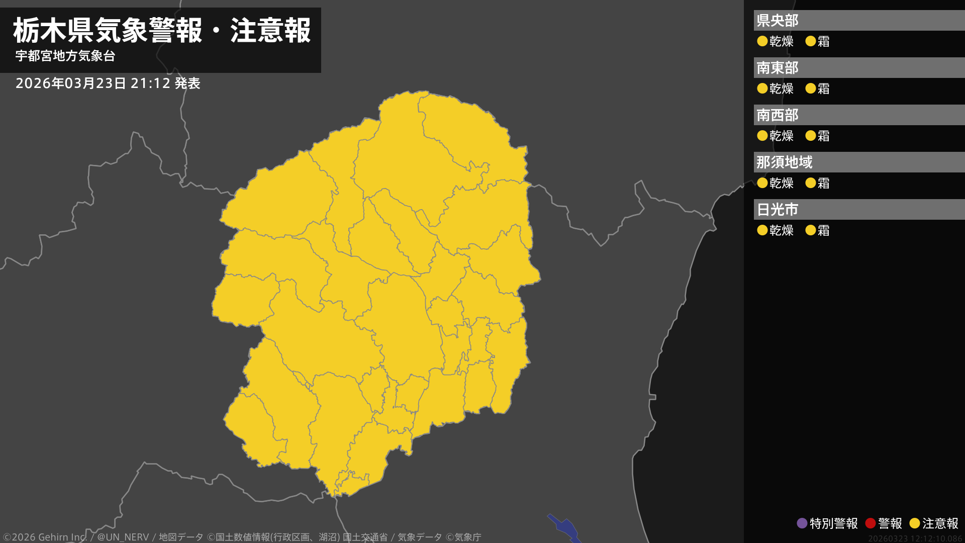 【栃木県 気象警報・注意報 2026年03月23日 21:12】栃木県では、24日まで空気の乾燥した状態が続くため、火の取り扱いに、24日朝は霜に対する農作物の管理に注意してください。#気象警報注意報 #栃木県