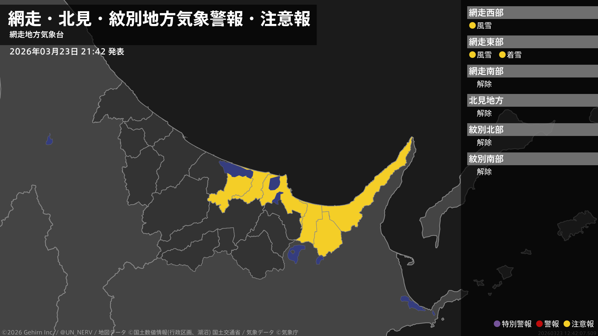 【網走・北見・紋別地方 気象警報・注意報 2026年03月23日 21:42】網走地方では、24日明け方から24日昼前まで風雪に、24日未明から24日昼前まで電線等への着雪に注意してください。#気象警報注意報 #網走・北見・紋別地方