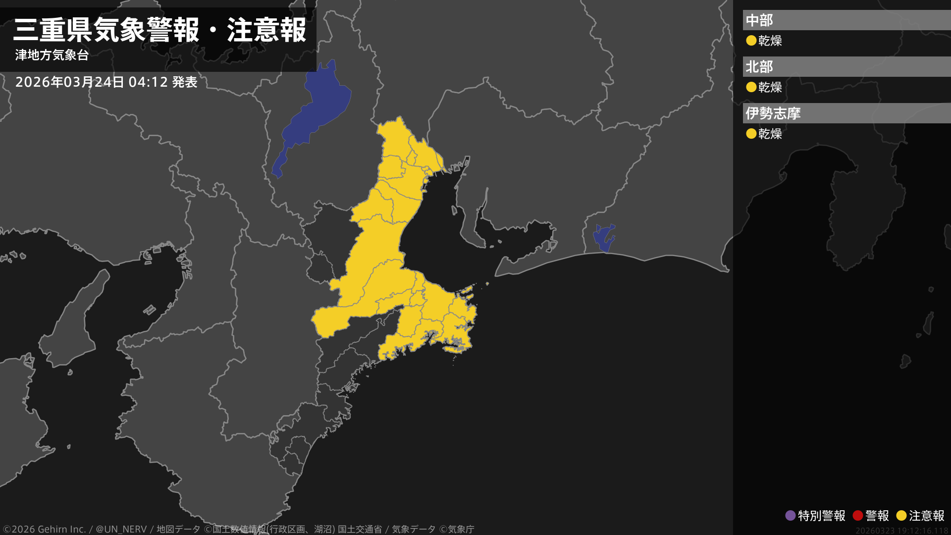 【三重県 気象警報・注意報 2026年03月24日 04:12】三重県では、24日まで空気の乾燥した状態が続くため、火の取り扱いに注意してください。#気象警報注意報 #三重県