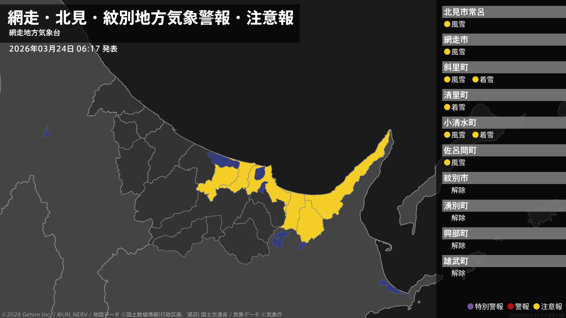 【網走・北見・紋別地方 気象警報・注意報 2026年03月24日 06:17】網走地方では、24日昼前まで風雪や電線等への着雪に注意してください。#気象警報注意報 #網走・北見・紋別地方