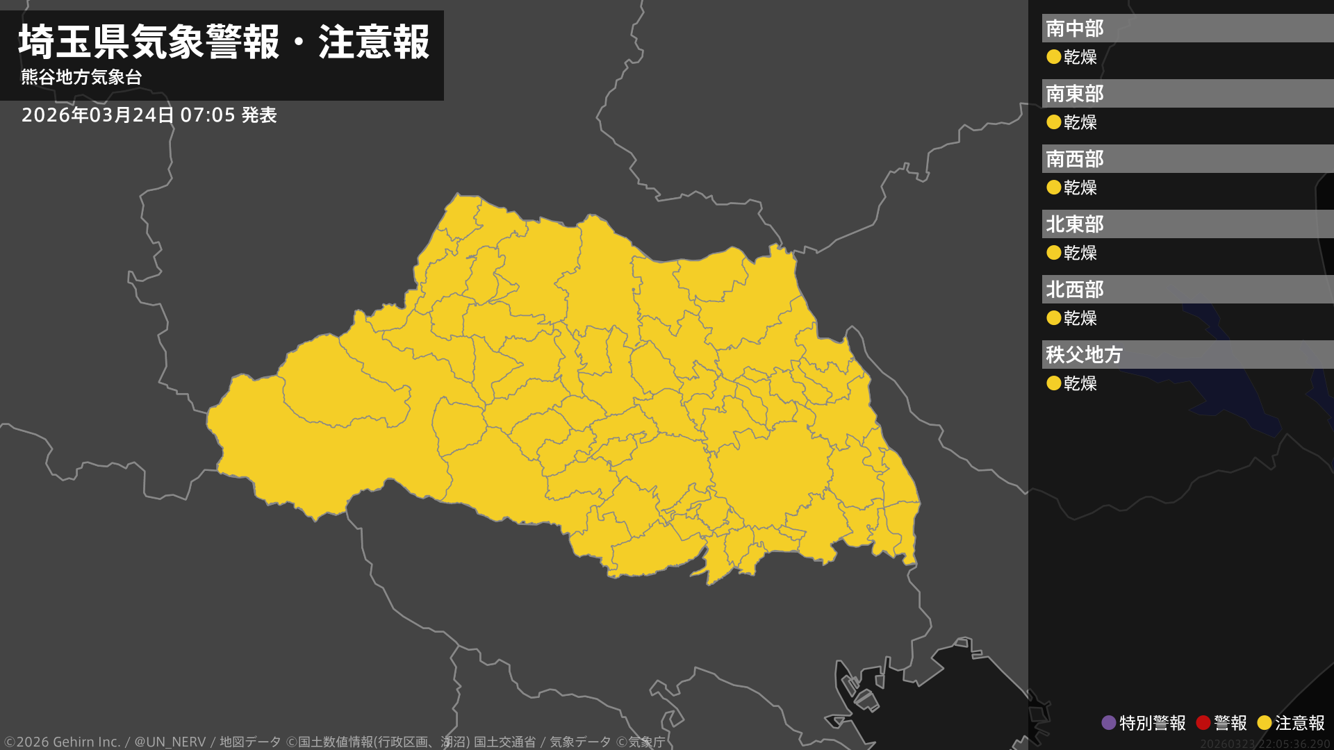 【埼玉県 気象警報・注意報 2026年03月24日 07:05】埼玉県では、24日まで空気の乾燥した状態が続くため、火の取り扱いに注意してください。#気象警報注意報 #埼玉県