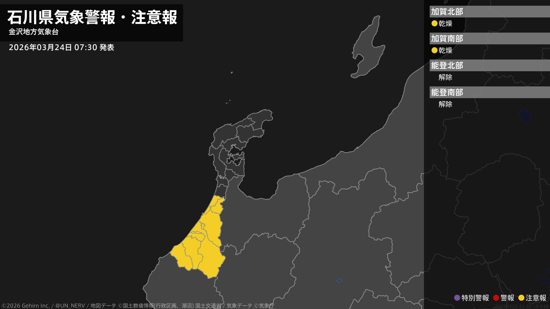 【石川県 気象警報・注意報 2026年03月24日 07:30】加賀では、25日まで空気の乾燥した状態が続くため、火の取り扱いに注意してください。#気象警報注意報 #石川県
