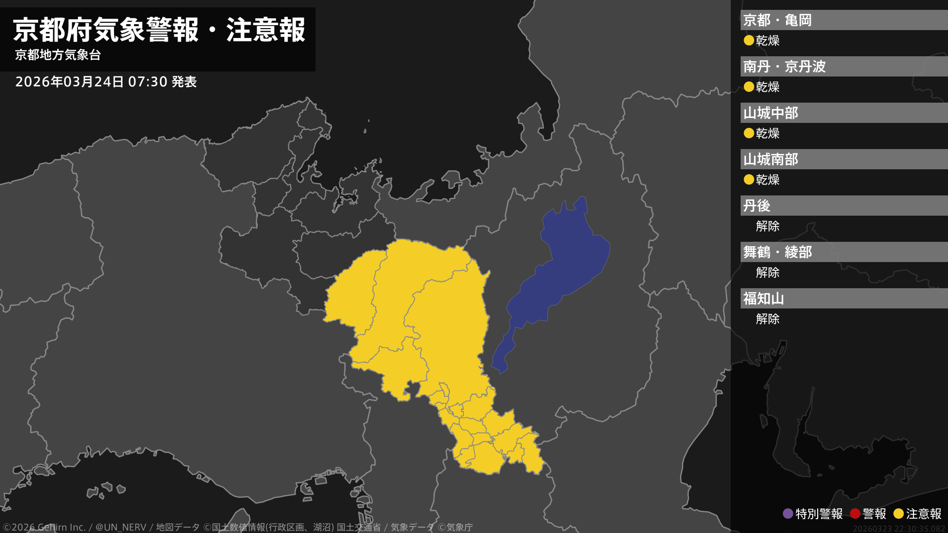 【京都府 気象警報・注意報 2026年03月24日 07:30】南部では、25日まで空気の乾燥した状態が続くため、火の取り扱いに注意してください。#気象警報注意報 #京都府