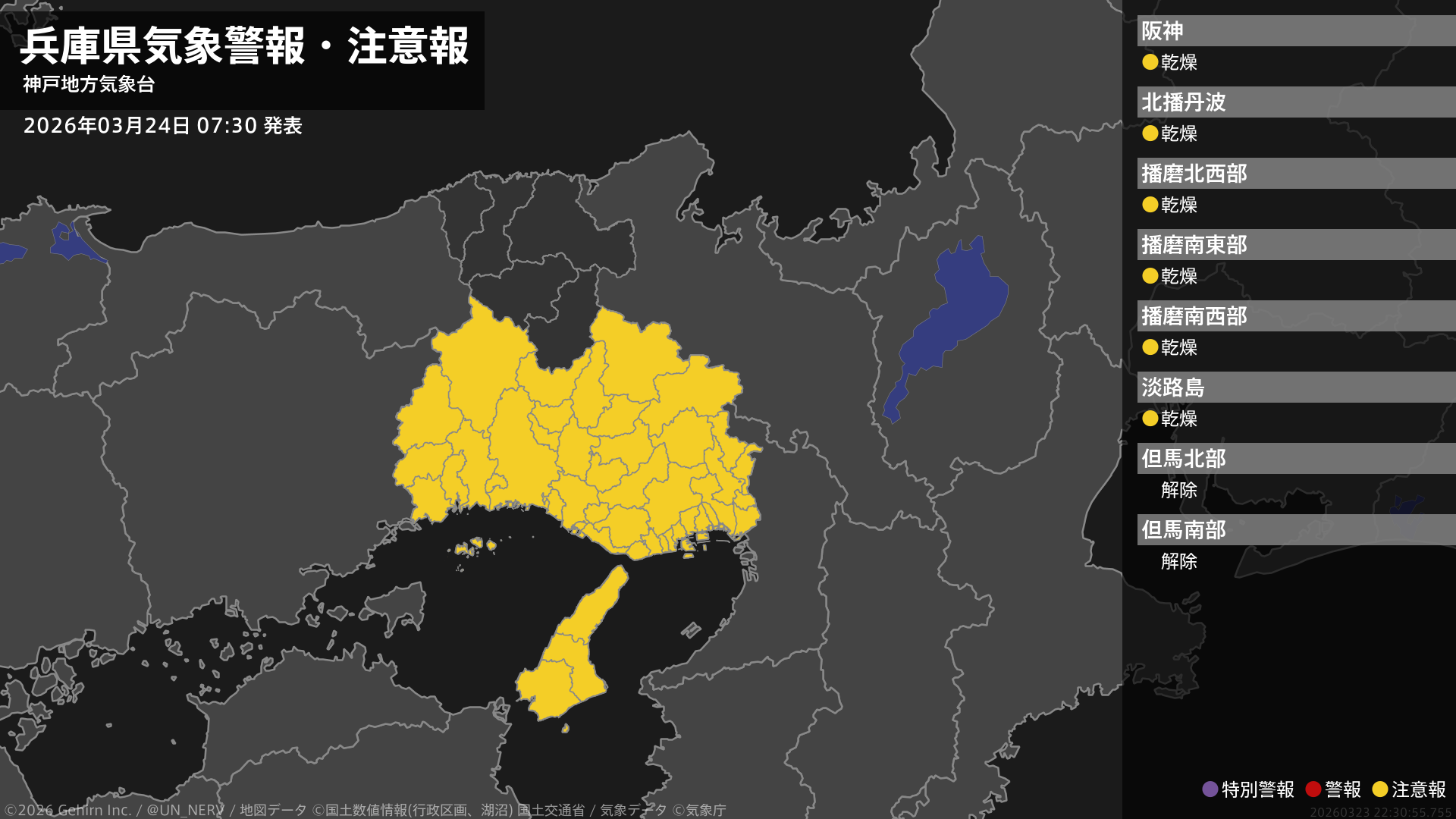 【兵庫県 気象警報・注意報 2026年03月24日 07:30】南部では、25日まで空気の乾燥した状態が続くため、火の取り扱いに注意してください。#気象警報注意報 #兵庫県