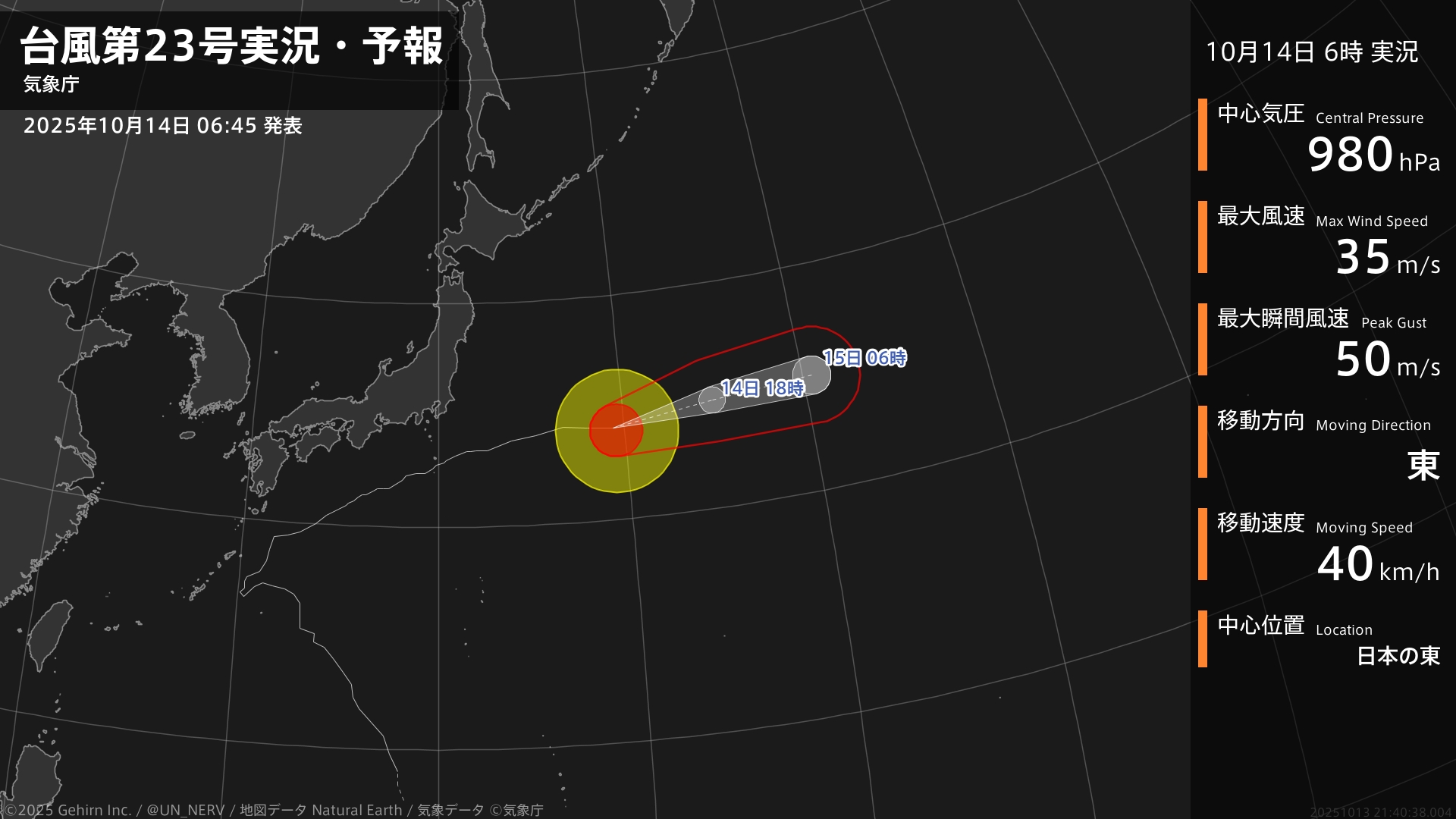 【台風第23号実況・予報 2025年10月14日 06:40】強い台風第23号(ナクリー)は、日本の東を1時間に40キロの速さで東に進んでいます。#台風情報