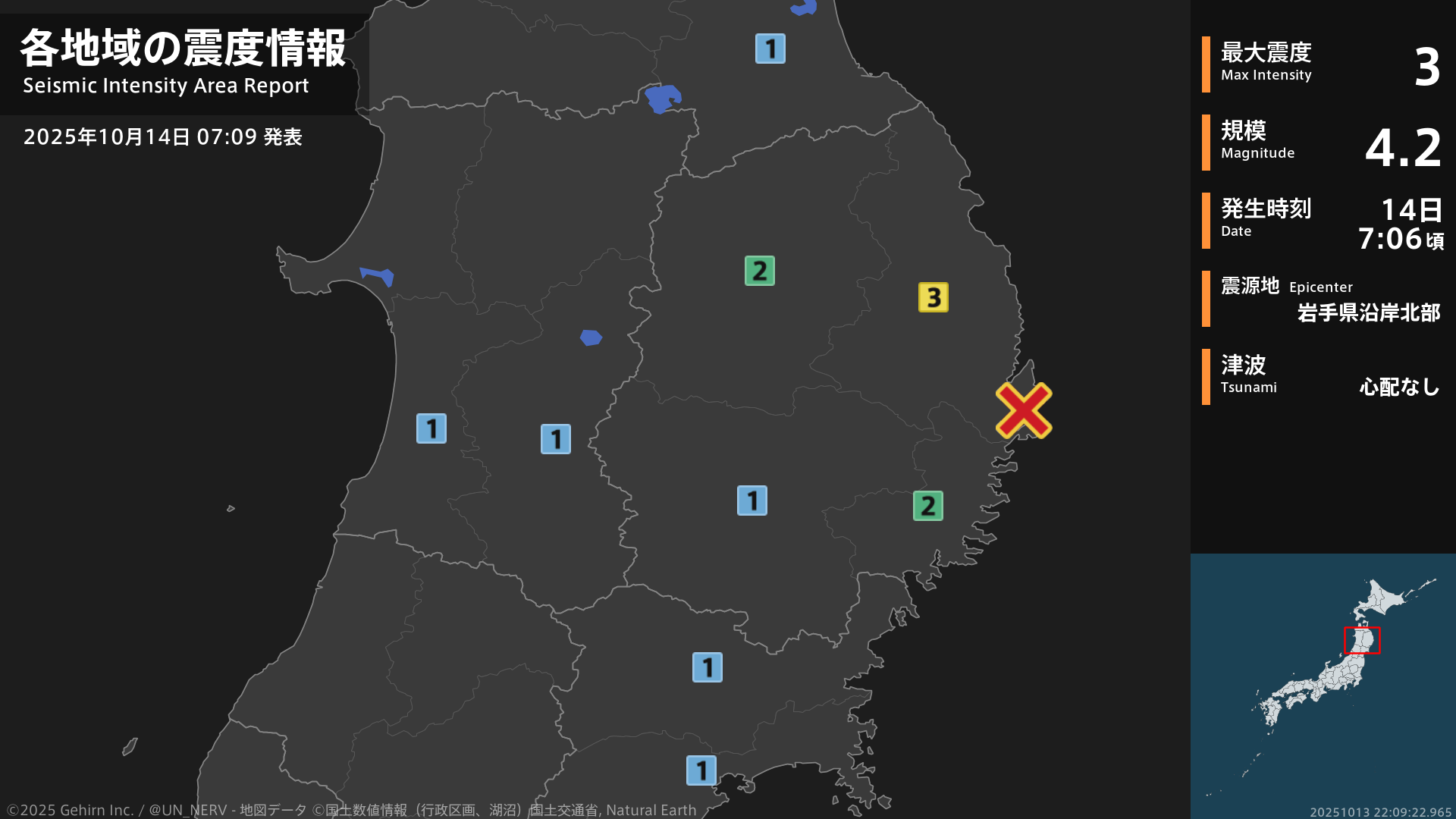 【地震情報 2025年10月14日】7時6分頃、岩手県沿岸北部を震源とする地震がありました。震源の深さは約20km、地震の規模はM4.2、最大震度3を岩手県で観測しています。この地震による津波の心配はありません。#地震 #岩手県 #青森県 #宮城県 #秋田県