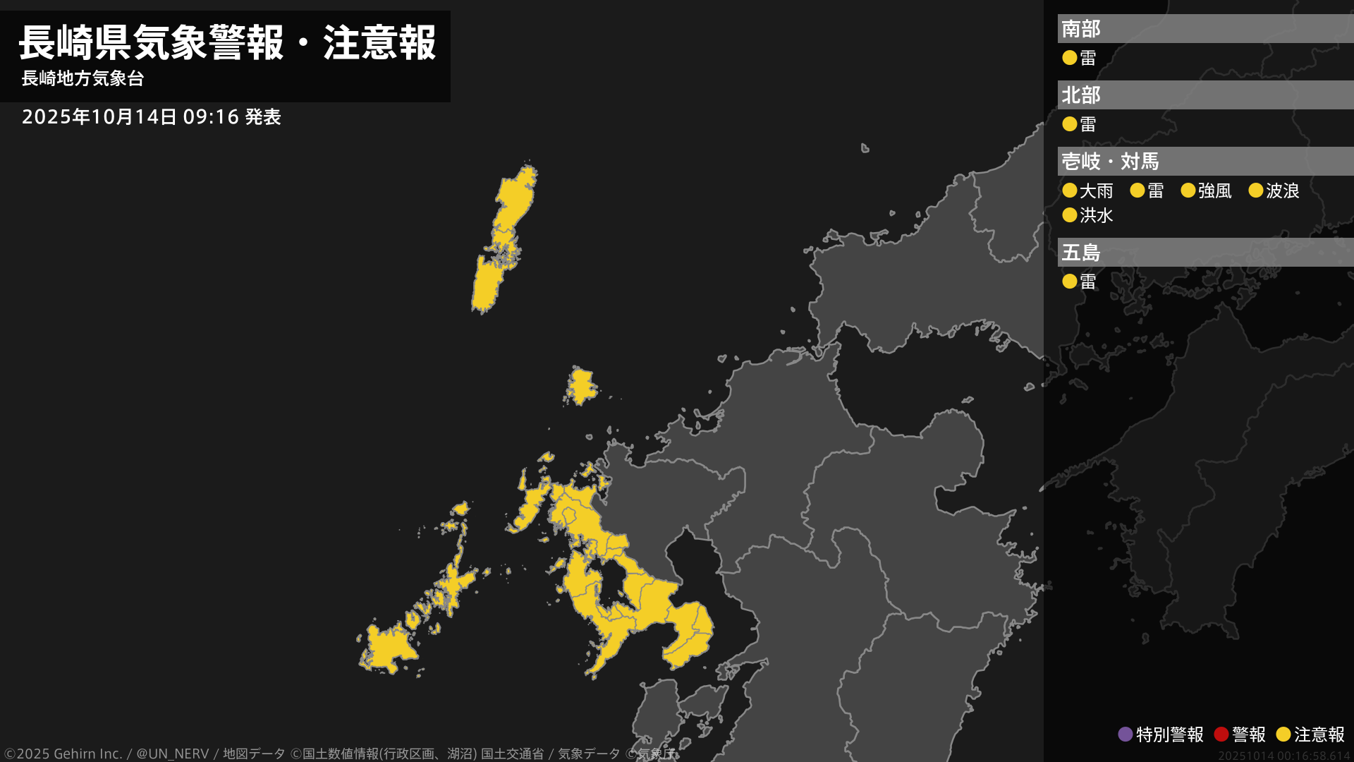 【長崎県 気象警報・注意報 2025年10月14日 09:16】壱岐・対馬では、低い土地の浸水や河川の増水、強風、高波に注意してください。長崎県では、竜巻などの激しい突風や落雷に注意してください。#気象警報注意報 #長崎県