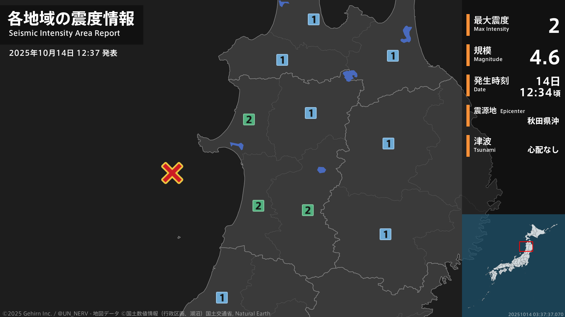 12時34分頃、秋田県沖を震源とする地震がありました。震源の深さは約10km、地震の規模はM4.6、最大震度2を秋田県で観測しています。この地震による津波の心配はありません。