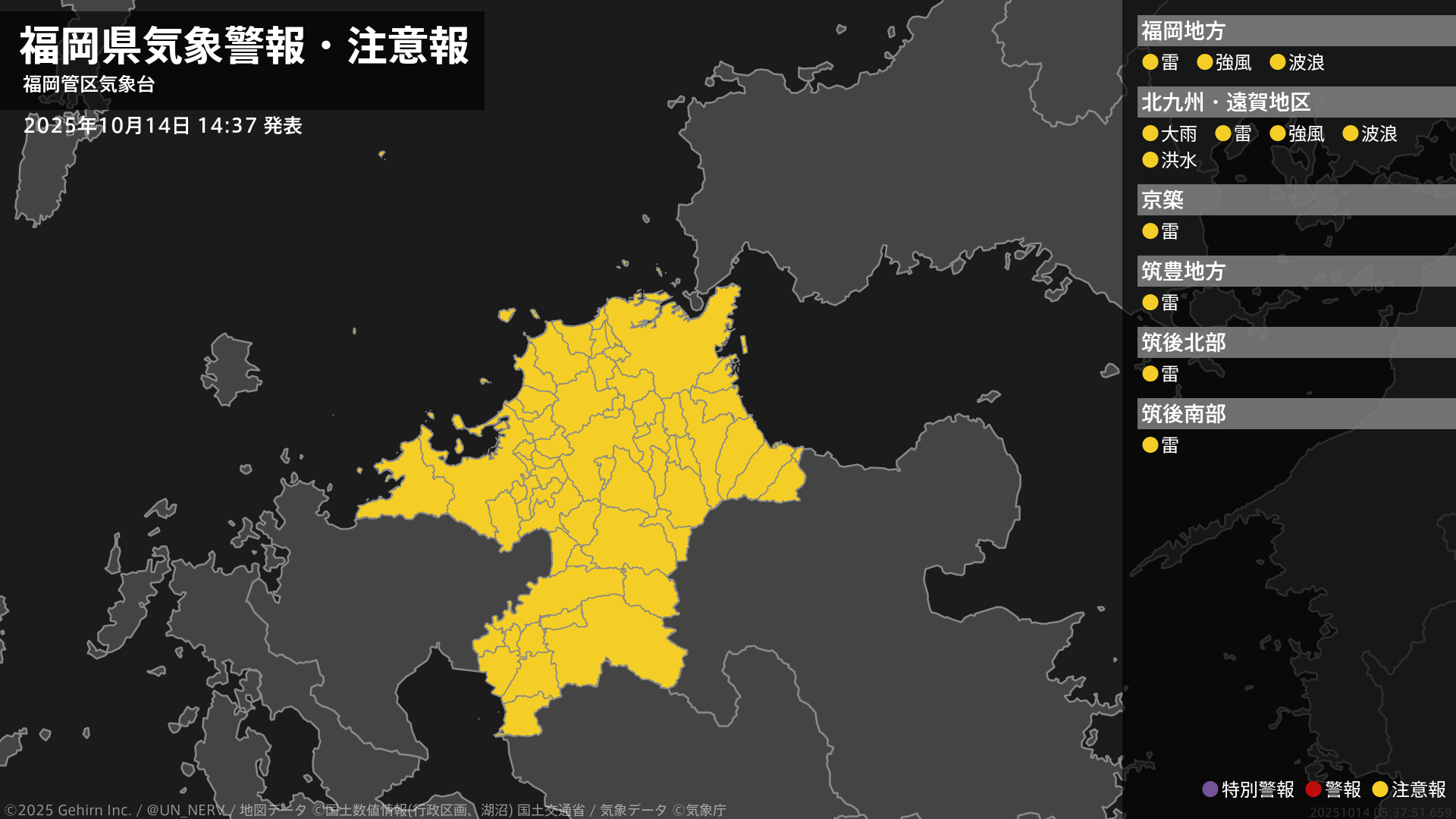 【福岡県 気象警報・注意報 2025年10月14日 14:37】
