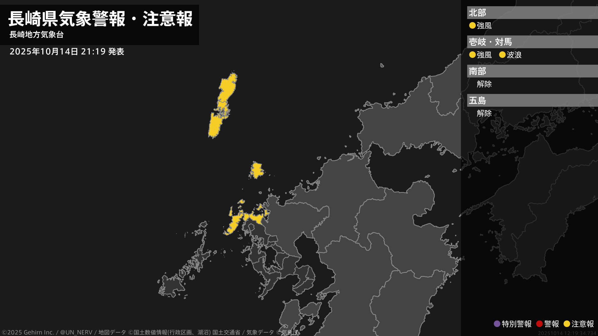 【長崎県 気象警報・注意報 2025年10月14日 21:19】壱岐・対馬では15日昼前まで、北部では15日未明から15日夕方まで、強風に注意してください。壱岐・対馬では、15日昼過ぎまで高波に注意してください。#気象警報注意報 #長崎県