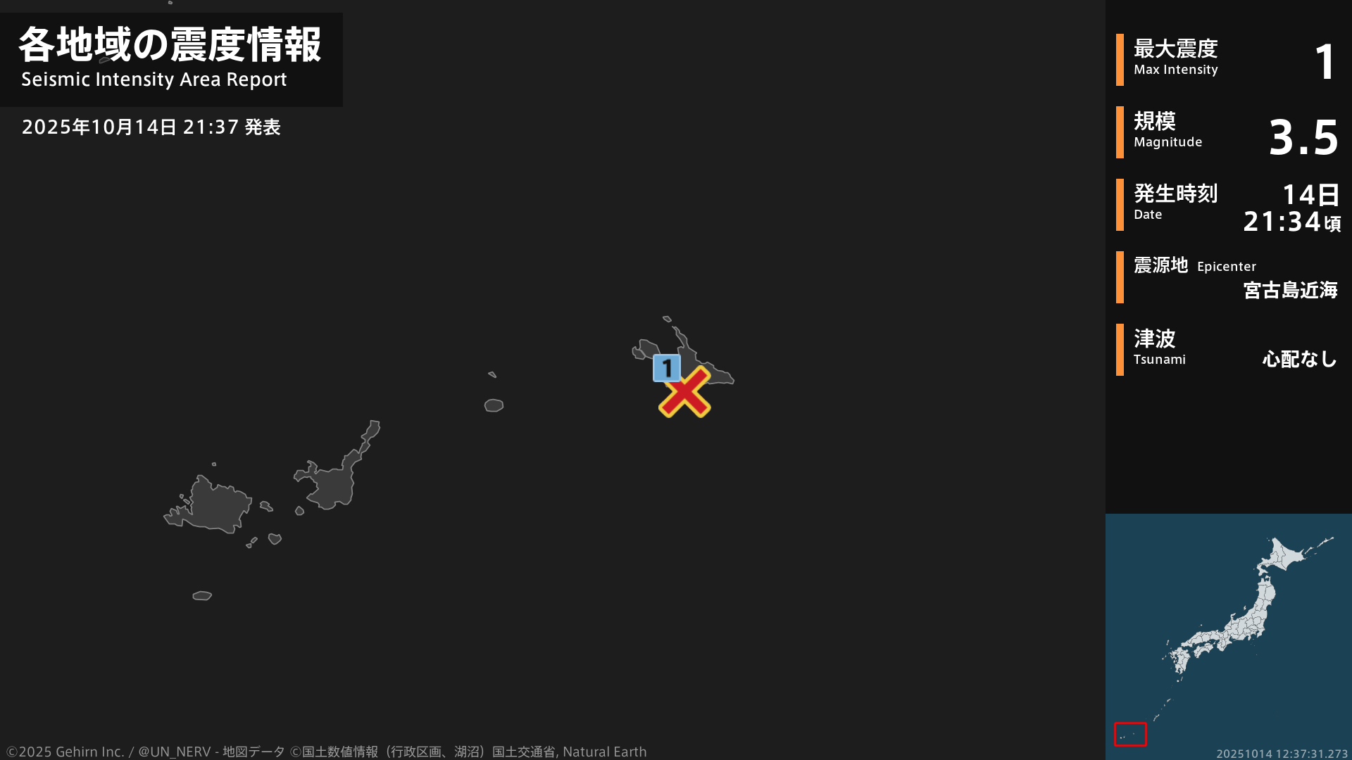 【地震情報 2025年10月14日】21時34分頃、宮古島近海を震源とする地震がありました。震源の深さは約50km、地震の規模はM3.5、最大震度1を沖縄県で観測しています。この地震による津波の心配はありません。#地震 #沖縄県