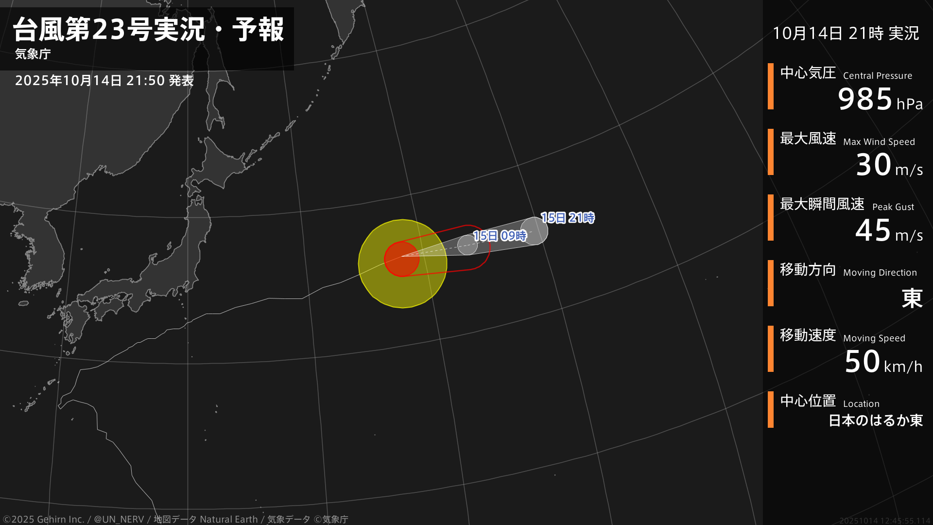 【台風第23号実況・予報 2025年10月14日 21:45】台風第23号(ナクリー)は、日本のはるか東を1時間に50キロの速さで東に進んでいます。#台風情報