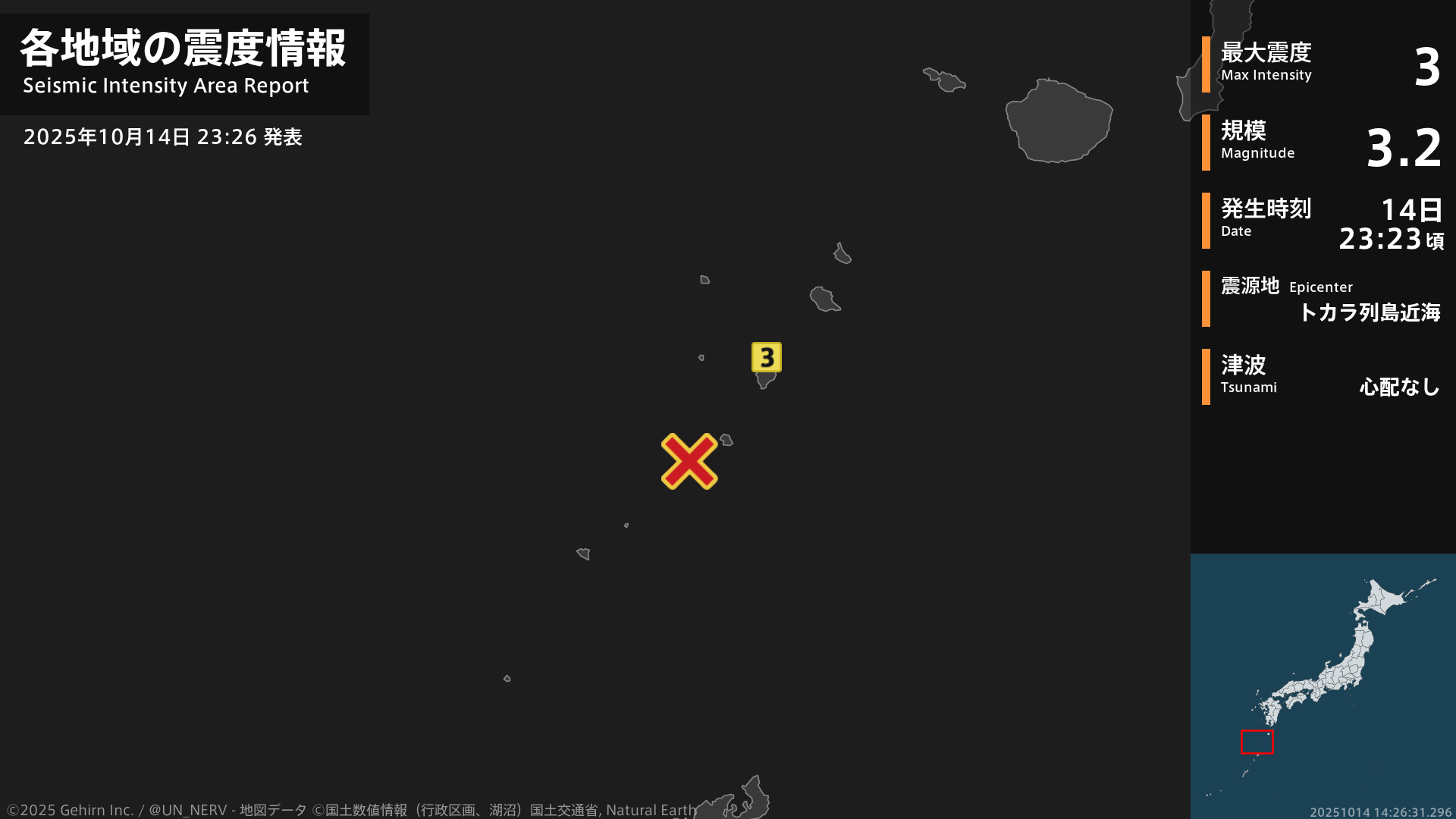 【地震情報 2025年10月14日】23時23分頃、トカラ列島近海を震源とする地震がありました。震源の深さは約20km、地震の規模はM3.2、最大震度3を鹿児島県で観測しています。この地震による津波の心配はありません。#地震 #鹿児島県
