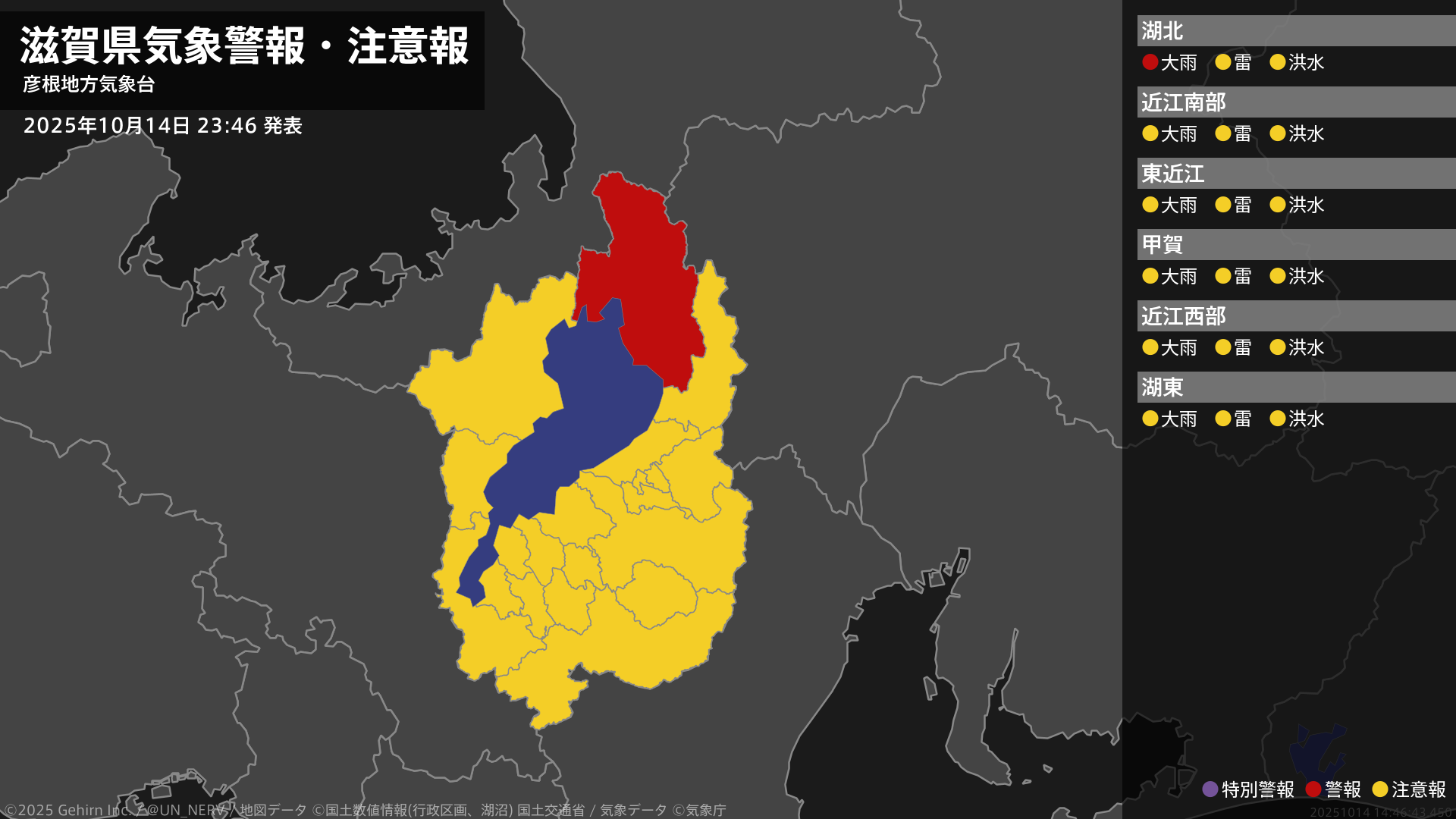 【滋賀県 気象警報・注意報 2025年10月14日 23:46】北部では、15日未明まで低い土地の浸水に警戒してください。#気象警報注意報 #滋賀県