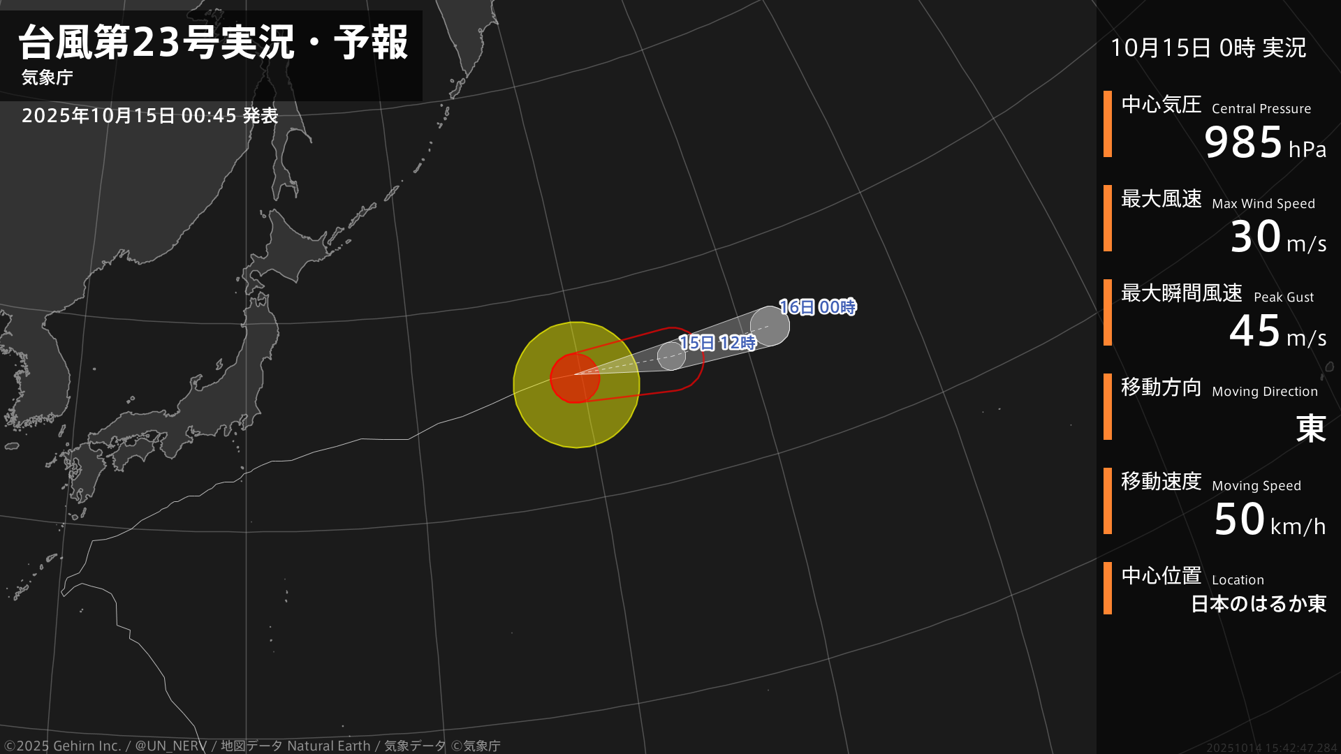 【台風第23号実況・予報 2025年10月15日 00:42】台風第23号(ナクリー)は、日本のはるか東を1時間に50キロの速さで東に進んでいます。#台風情報