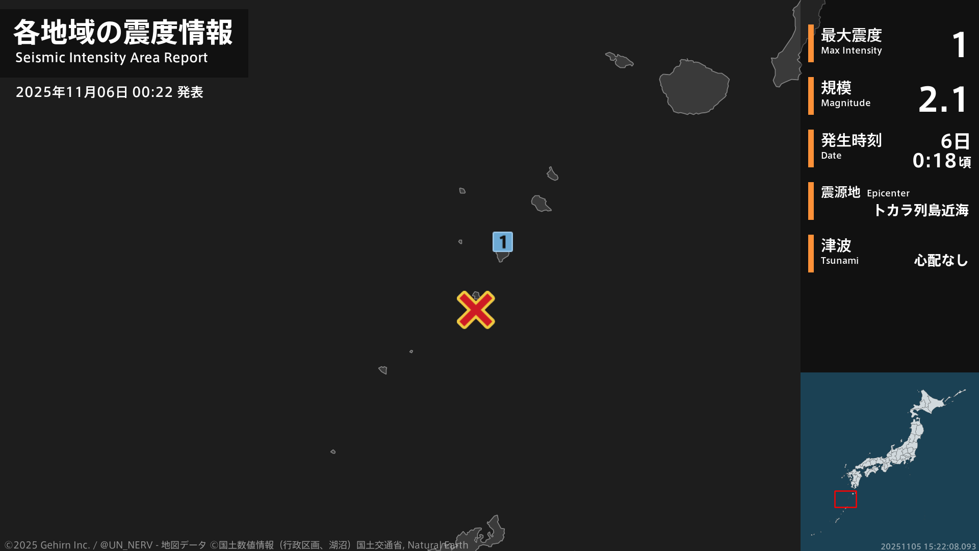 【地震情報 2025年11月6日】0時18分頃、トカラ列島近海を震源とする地震がありました。震源の深さは約10km、地震の規模はM2.1、最大震度1を鹿児島県で観測しています。この地震による津波の心配はありません。#地震 #鹿児島県