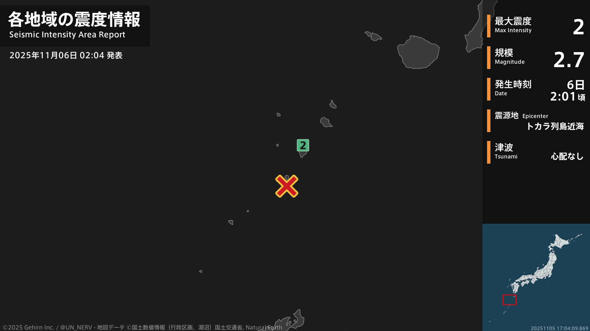 【地震情報 2025年11月6日】2時1分頃、トカラ列島近海を震源とする地震がありました。震源の深さは約20km、地震の規模はM2.7、最大震度2を鹿児島県で観測しています。この地震による津波の心配はありません。#地震 #鹿児島県