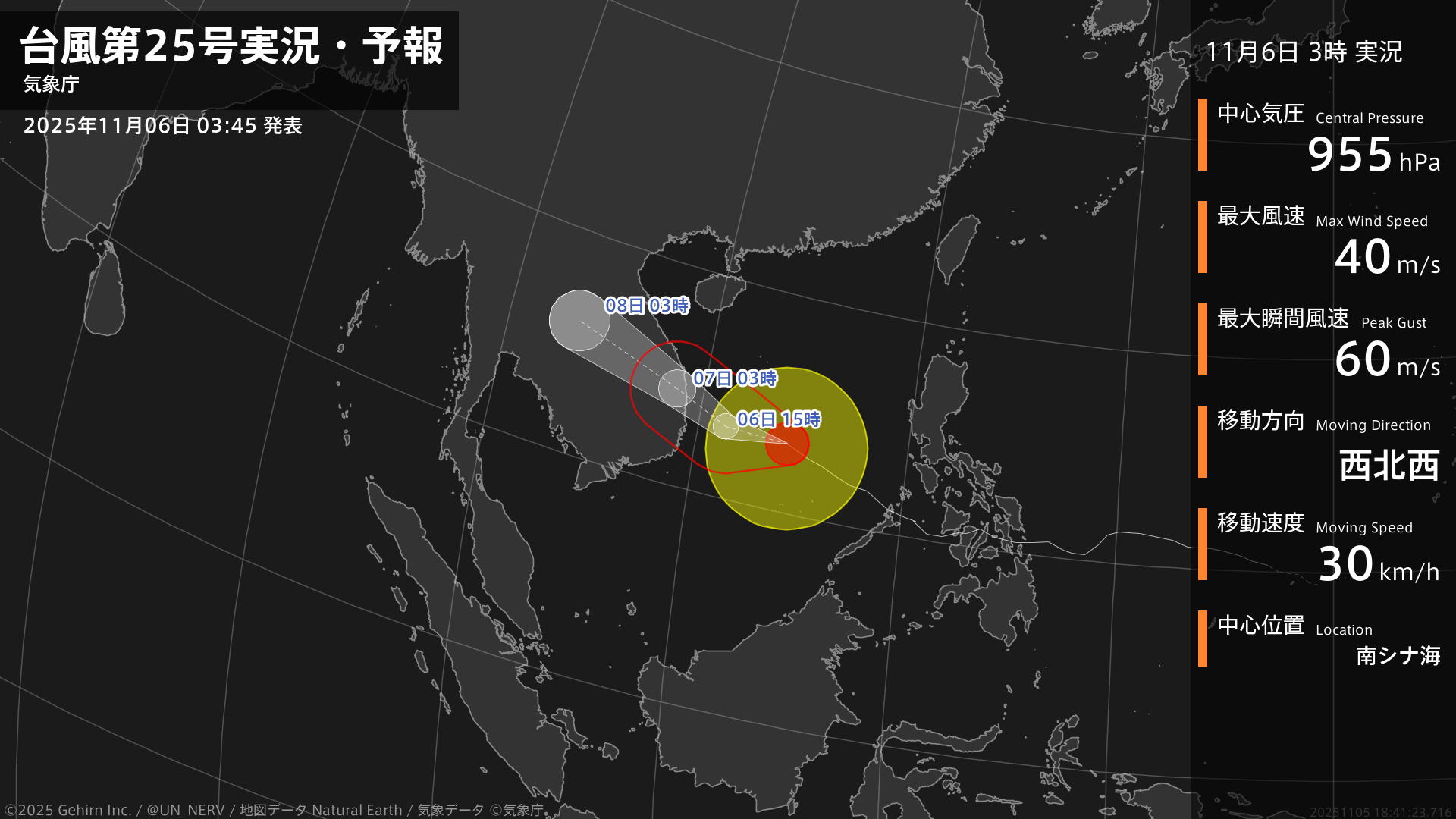 【台風第25号実況・予報 2025年11月06日 03:41】強い台風第25号(カルマエギ)は、南シナ海を1時間に30キロの速さで西北西に進んでいます。#台風情報