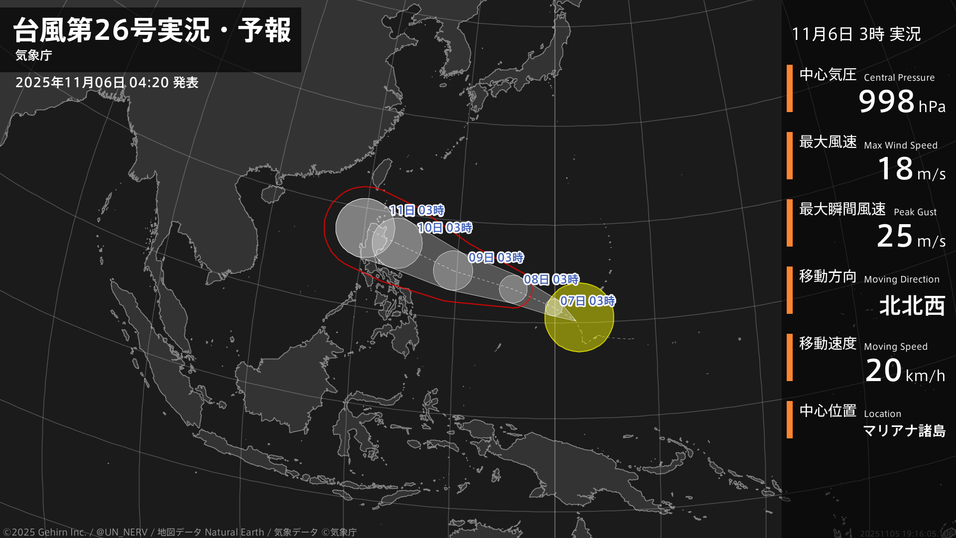 【台風第26号実況・予報 2025年11月06日 04:16】台風第26号(フォンウォン)が発生しました。#台風情報