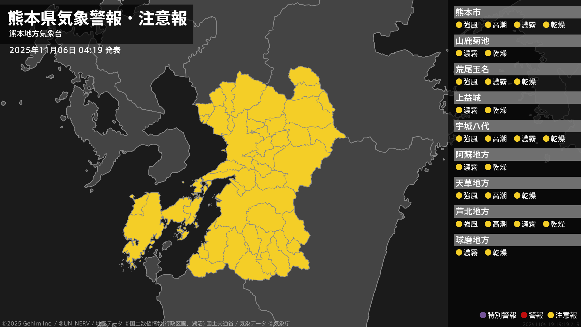 【熊本県 気象警報・注意報 2025年11月06日 04:19】熊本、天草・芦北地方では、強風や高潮に注意してください。熊本県では、濃霧による視程障害と、空気の乾燥した状態が続くため火の取り扱いに注意してください。#気象警報注意報 #熊本県