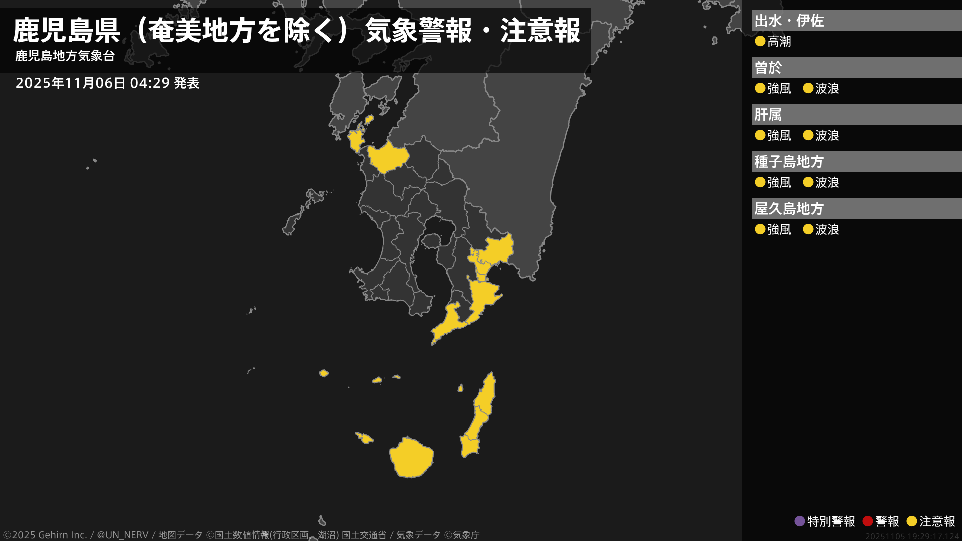 【鹿児島県(奄美地方を除く) 気象警報・注意報 2025年11月06日 04:29】大隅、種子島・屋久島地方では、強風や高波に注意してください。薩摩地方では、高潮に注意してください。#気象警報注意報 #鹿児島県(奄美地方除く)