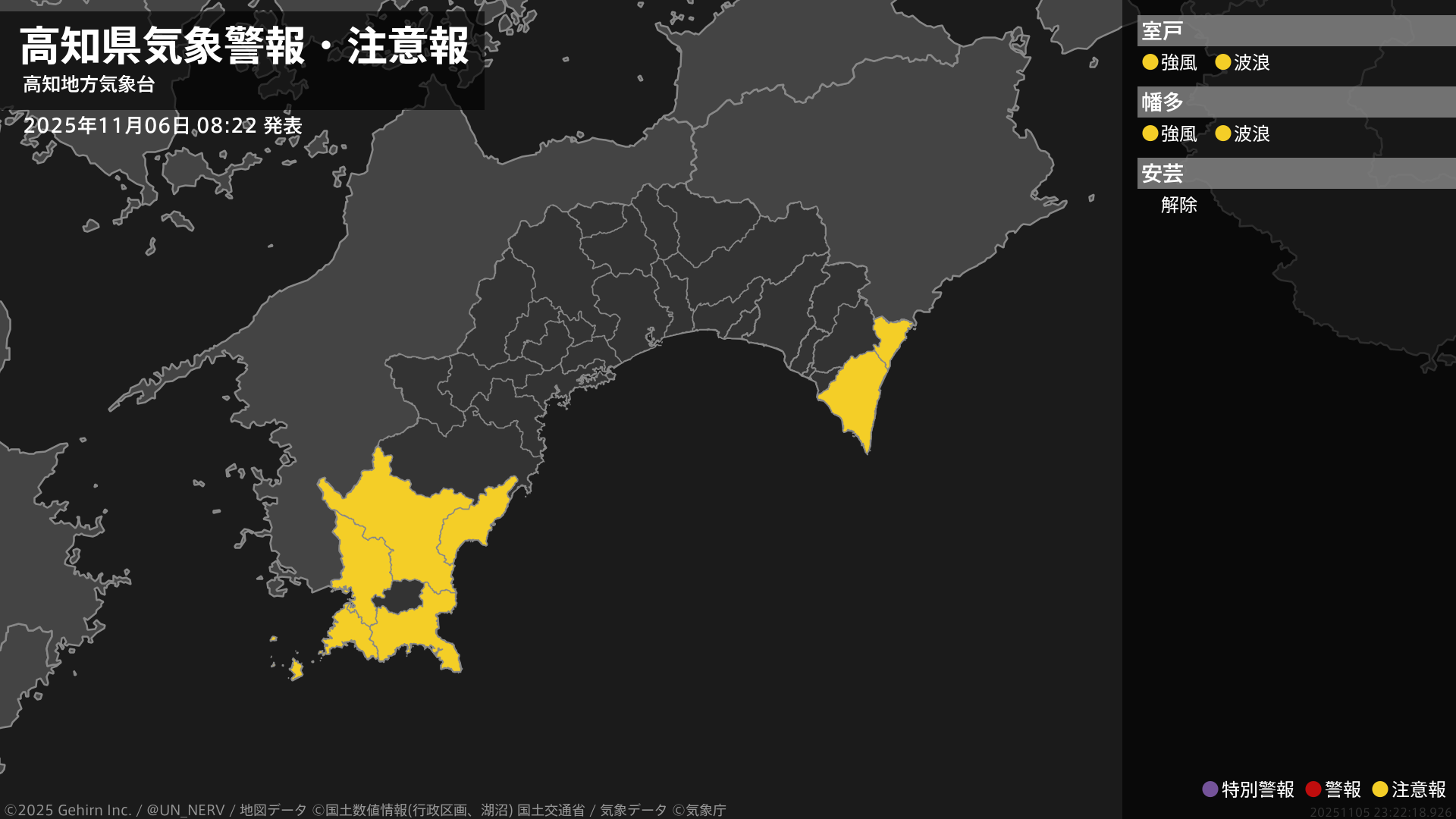 【高知県 気象警報・注意報 2025年11月06日 08:22】東部、西部では、強風や高波に注意してください。#気象警報注意報 #高知県
