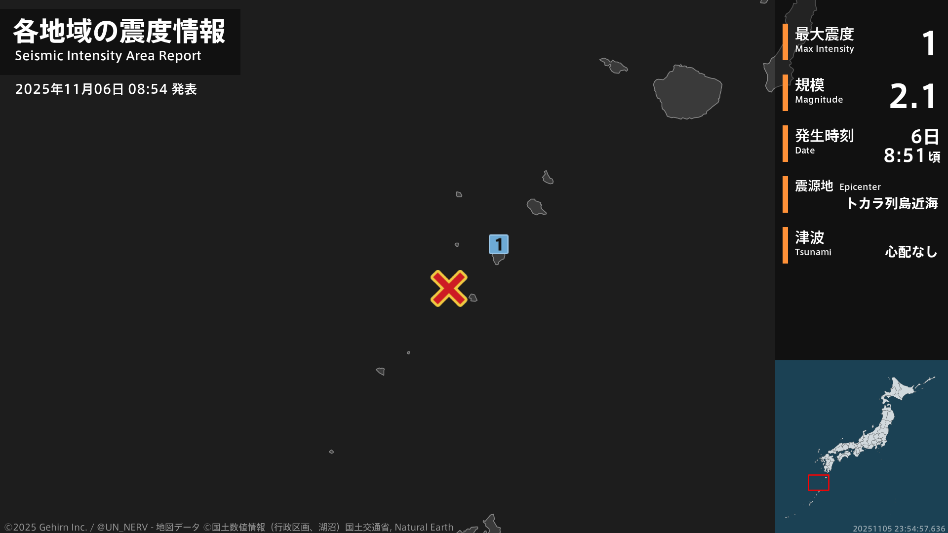 【地震情報 2025年11月6日】8時51分頃、トカラ列島近海を震源とする地震がありました。震源の深さは約20km、地震の規模はM2.1、最大震度1を鹿児島県で観測しています。この地震による津波の心配はありません。#地震 #鹿児島県