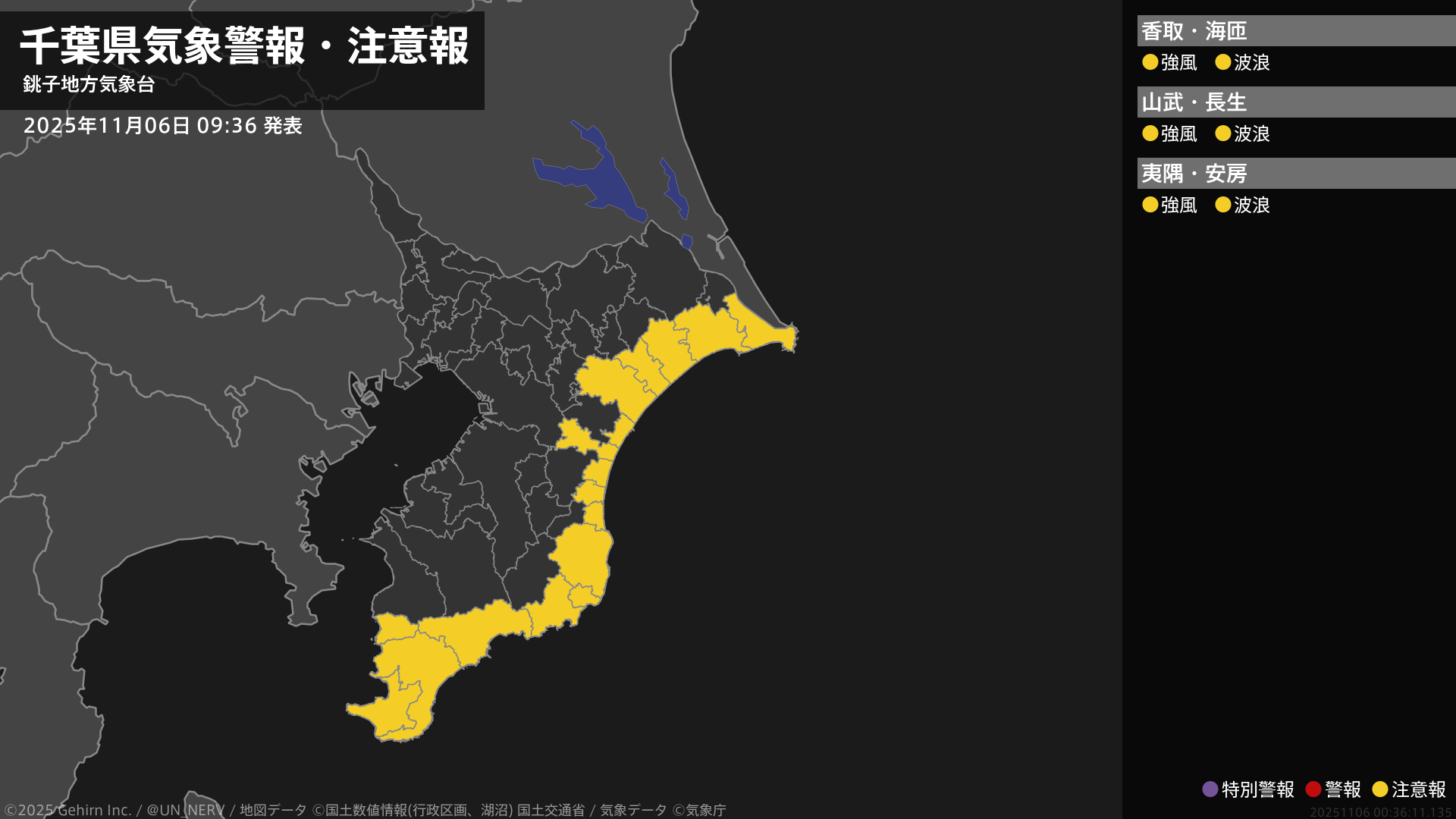 【千葉県 気象警報・注意報 2025年11月06日 09:36】北東部、南部では、強風や高波に注意してください。#気象警報注意報 #千葉県