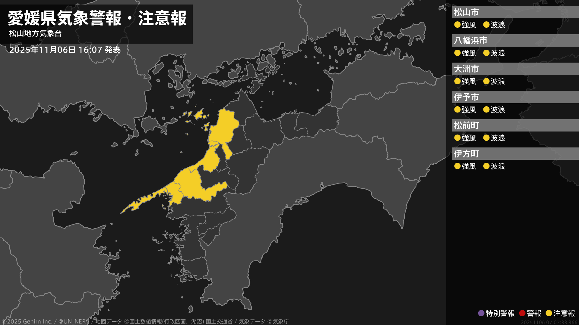 【愛媛県 気象警報・注意報 2025年11月06日 16:07】中予、南予では、6日夜のはじめ頃から7日明け方まで強風や高波に注意してください。#気象警報注意報 #愛媛県