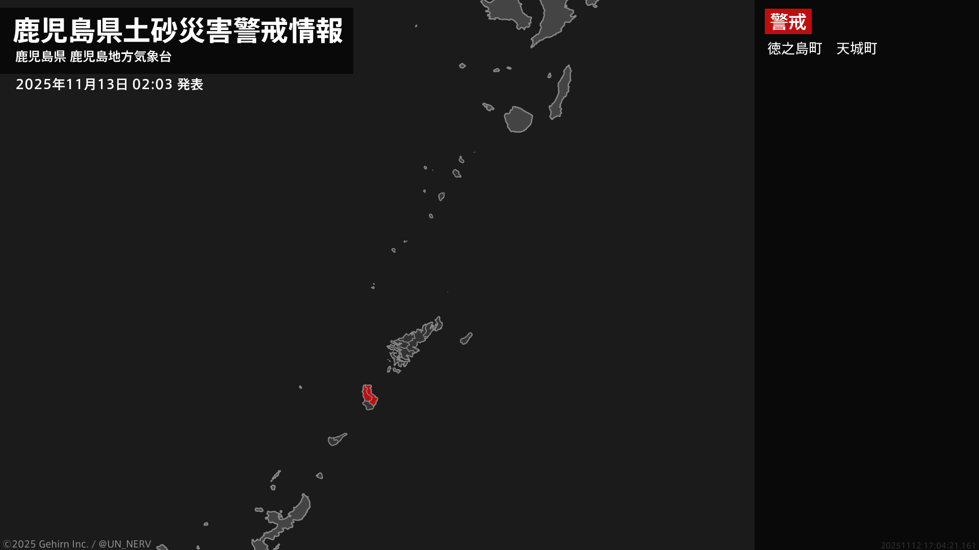 【鹿児島県 土砂災害警戒情報 2025年11月13日 02:04】鹿児島県の警戒対象地域では土砂災害の危険度が高まっています。身の安全を確保するよう努めてください。#土砂災害警戒情報 #鹿児島県