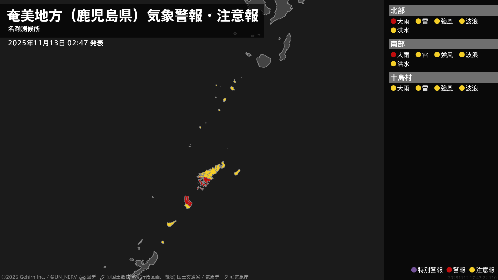 【奄美地方(鹿児島県) 気象警報・注意報 2025年11月13日 03:17】奄美地方では、13日夜遅くまで土砂災害に、13日昼前まで低い土地の浸水に警戒してください。#気象警報注意報 #奄美地方
