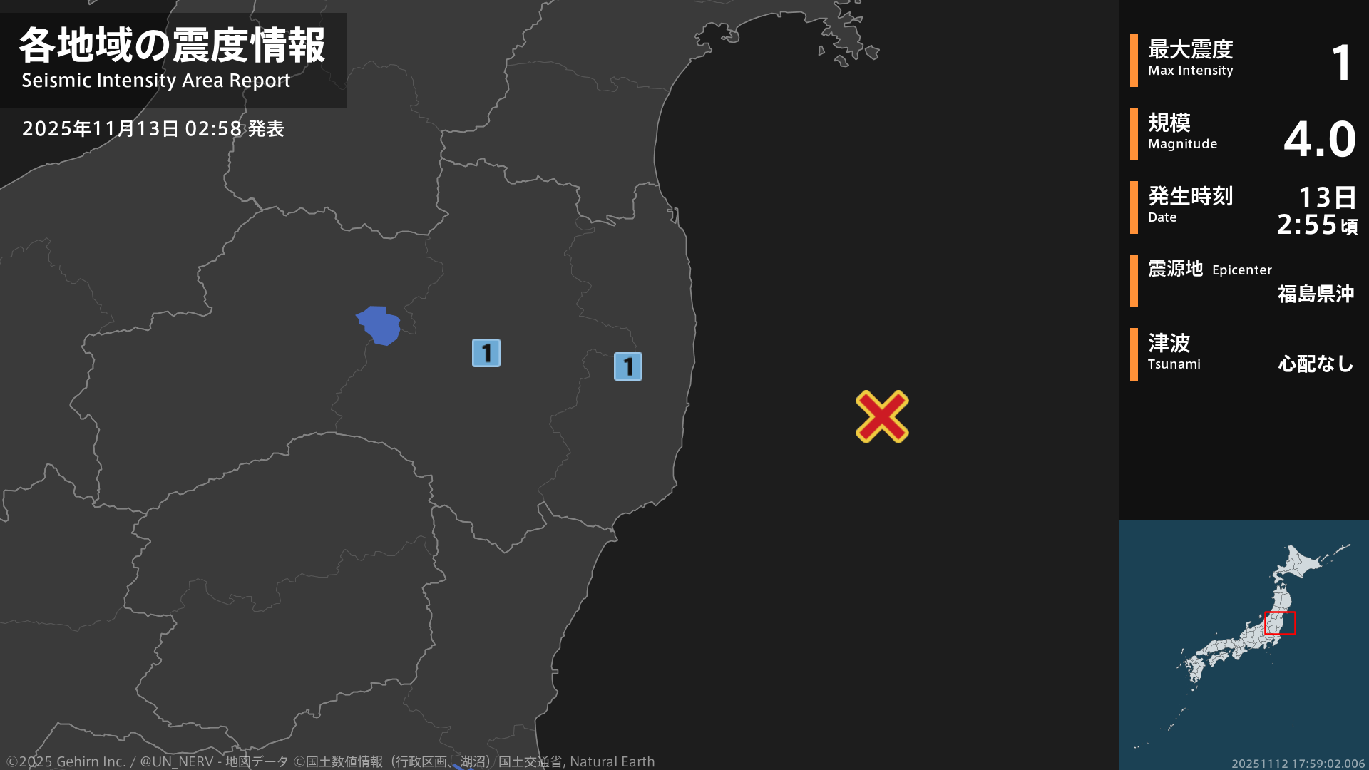 【地震情報 2025年11月13日】2時55分頃、福島県沖を震源とする地震がありました。震源の深さは約50km、地震の規模はM4.0、最大震度1を福島県で観測しています。この地震による津波の心配はありません。#地震 #福島県