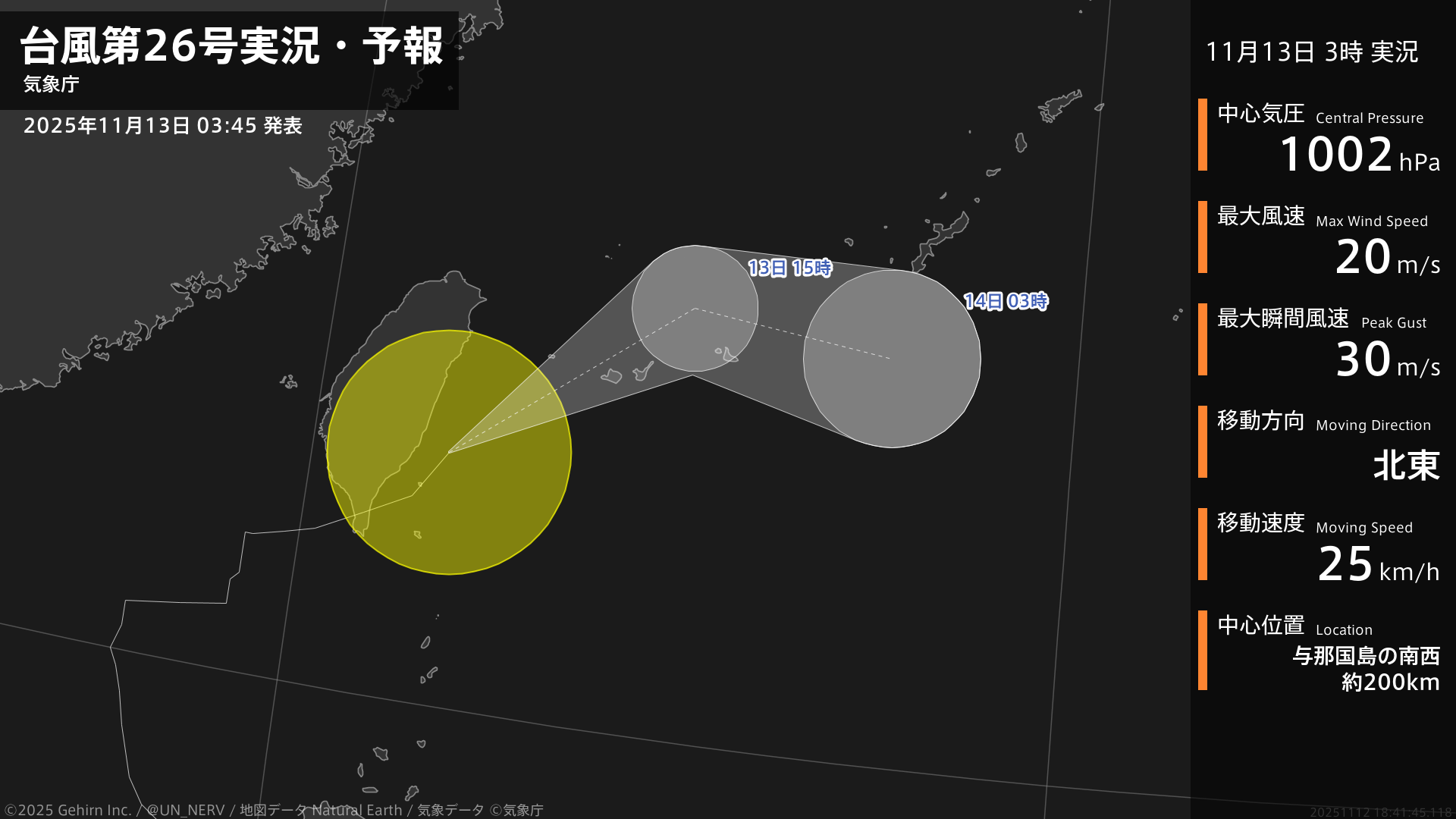 【台風第26号実況・予報 2025年11月13日 03:41】台風第26号(フォンウォン)は、与那国島の南西約200kmを1時間に25キロの速さで北東に進んでいます。#台風情報