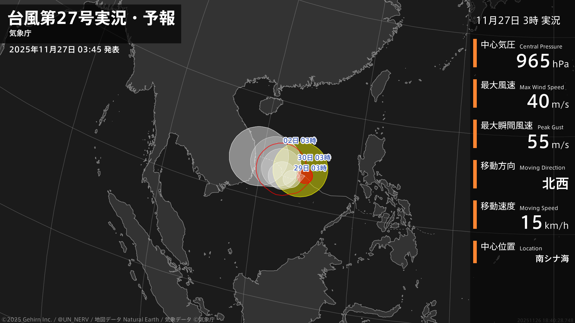 【台風第27号実況・予報 2025年11月27日 03:40】強い台風第27号(コト)は、南シナ海を1時間に15キロの速さで北西に進んでいます。#台風情報