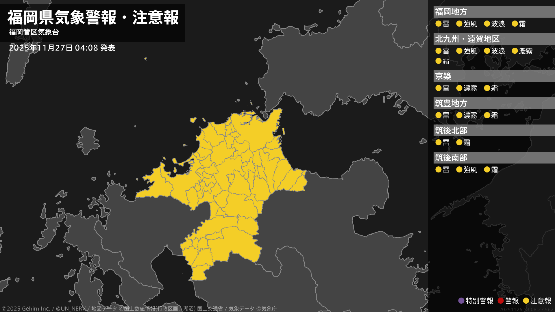 【福岡県 気象警報・注意報 2025年11月27日 04:08】福岡県では、強風や高波、竜巻などの激しい突風、急な強い雨、落雷、濃霧による視程障害、霜に対する農作物の管理に注意してください。#気象警報注意報 #福岡県