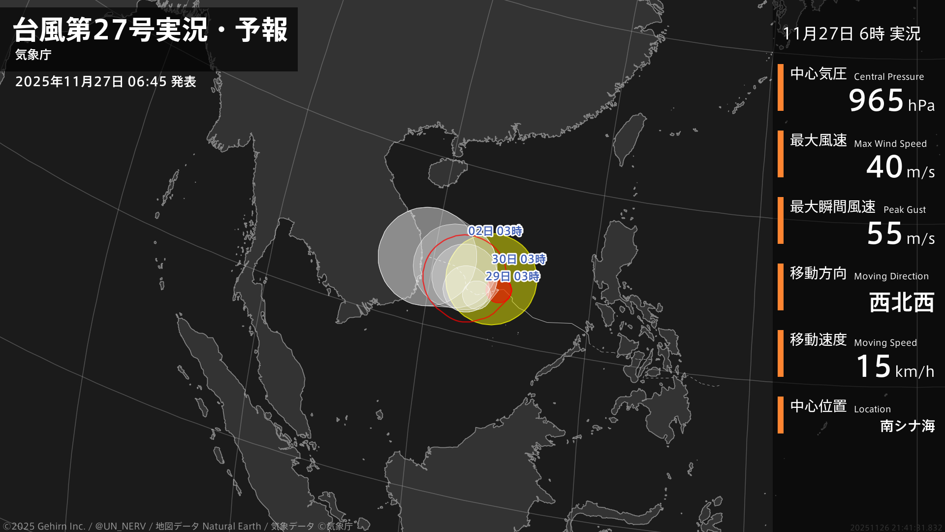 【台風第27号実況・予報 2025年11月27日 06:41】強い台風第27号(コト)は、南シナ海を1時間に15キロの速さで西北西に進んでいます。#台風情報
