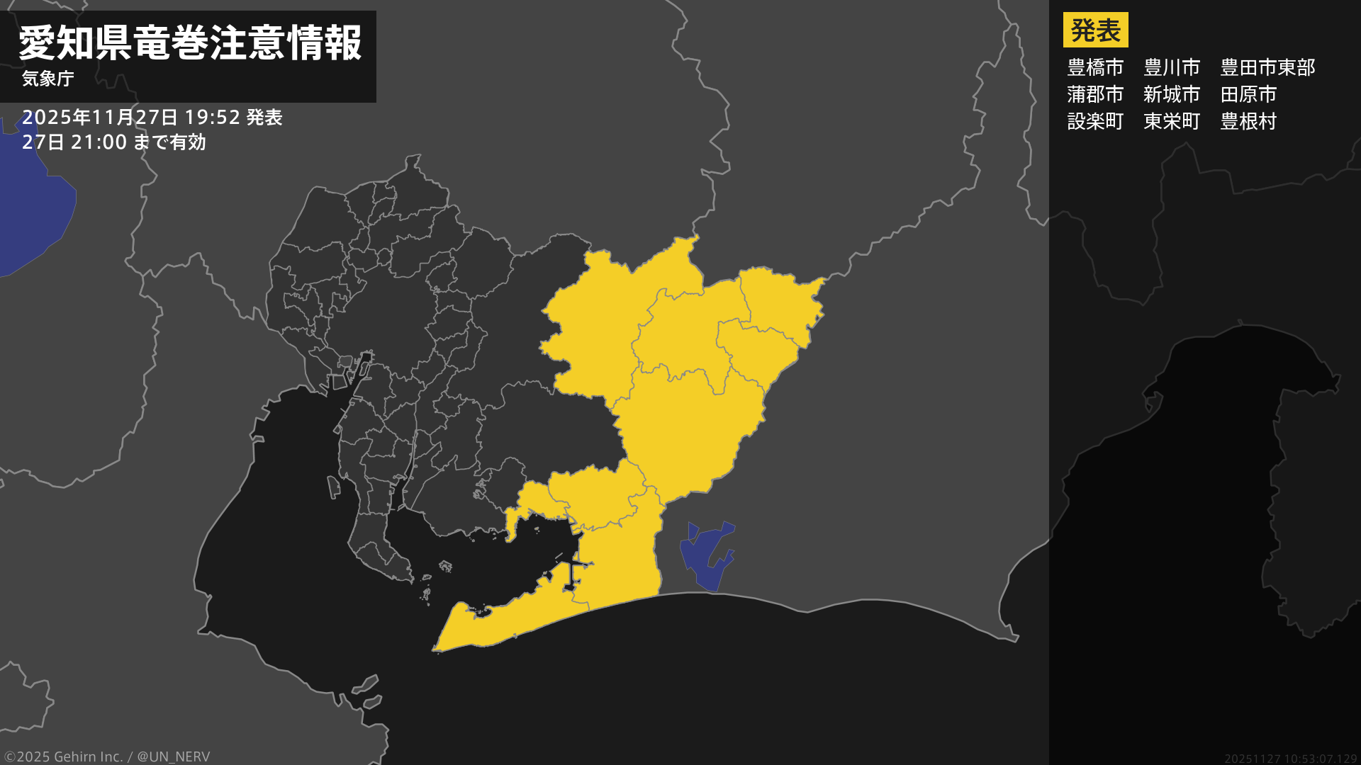 愛知県は、竜巻などの激しい突風が発生しやすい気象状況になっています。頑丈な建物内に移動するなど安全確保に努めてください。この情報は27日22:00まで有効です。
